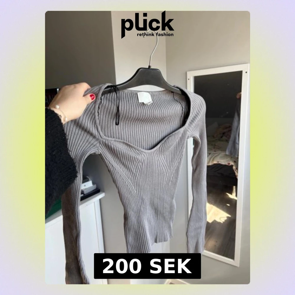 Snygg grå ribbad topp med lång ärm och markerad v-ringning. Figurnära passform och stretchigt material som ger en modern look. Perfekt att styla med jeans eller kjol för en trendig outfit. Aldrig använd ❣️