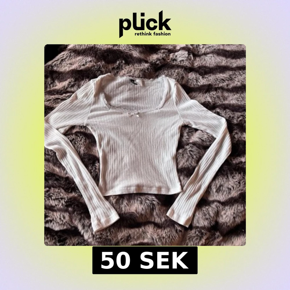 Söt vit långärmad topp i ribbat material med fyrkantig urringning. Dekorerad med spetskant och liten rosett framtill. Stretchig och figurnära passform, perfekt till jeans eller kjol.