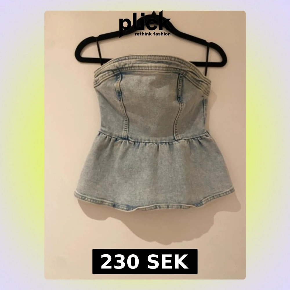 Trendig axelbandslös korsettopp i ljusblå denim med markerade sömmar och volang nedtill.
