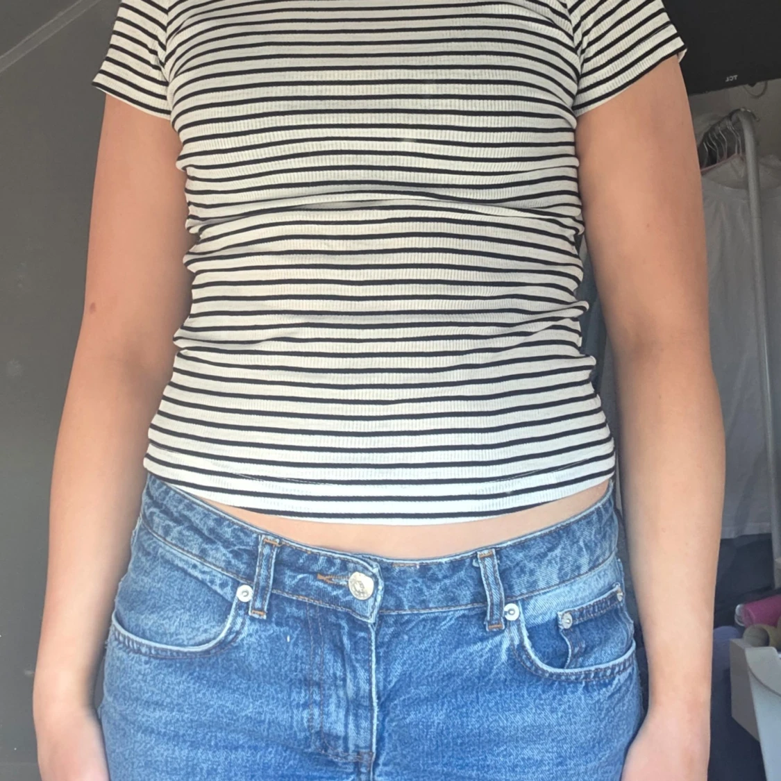 Säljer en stilren randig t-shirt med korta ärmar. Den är ribbad och har en tight passform, perfekt för en avslappnad look. Svart och vit i färgerna.