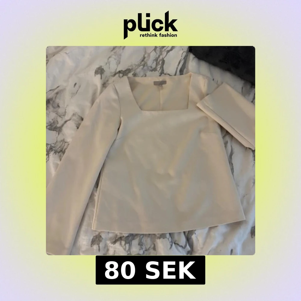 Säljer en stilren beige topp från H&M i storlek XS. Toppen har lång ärm och en snygg fyrkantig urringning som ger en modern vibe. Materialet känns mjukt och har en lätt glans, perfekt för att lyfta din outfit. Passar dig som gillar minimalistisk och clean stil.