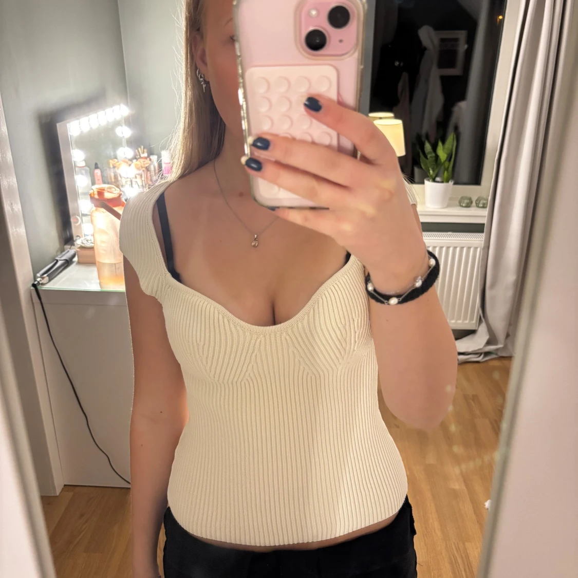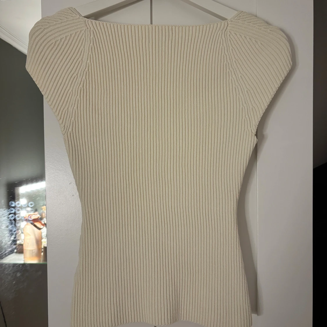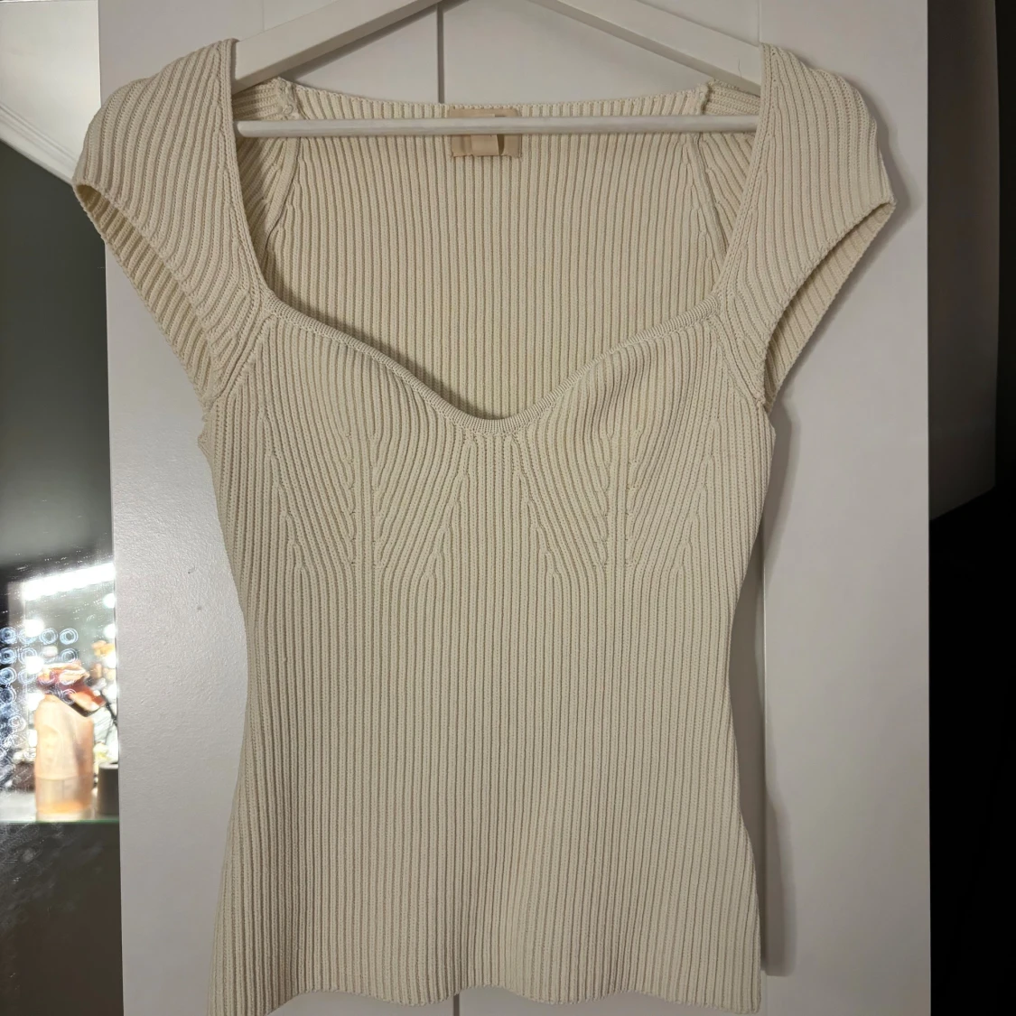 Säljer denna jättesnygga ribbstickade toppen från HM!! Använd fåtal gånger därav är den som ny. Färgen är beige/vit. Skriv gärna om du undrar något!!❤️❤️