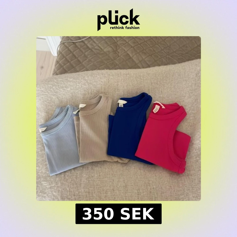 4 stycken ribbade linnetoppar från H&M. Alla förutom den ljusblåa är xs och den ljusblåa är s. Säljer alla 4 för 350kr och 1 för 100kr. Använda enstaka gånger. 💓Skriv för fler bilder på de andra färgerna🫶🏼