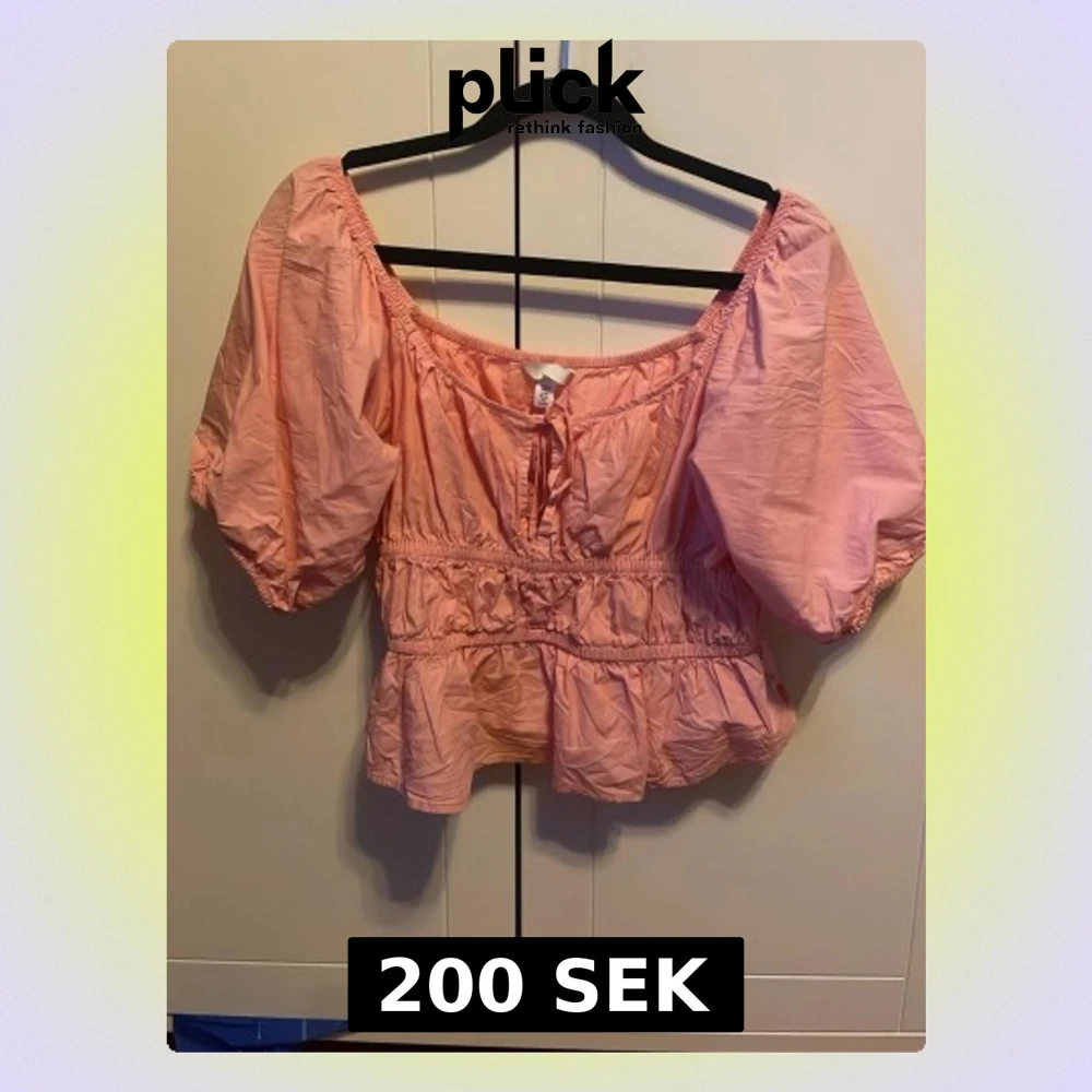 Supersöt ljusrosa blus med puffiga ärmer. Toppen har smock i midjan, volangkant nedtill och en liten rosett framtill. Croppad modell som ger en avslappnad men ändå romantisk vibe. Perfekt till jeans eller kjol! Är i storlek M men passar XS/S