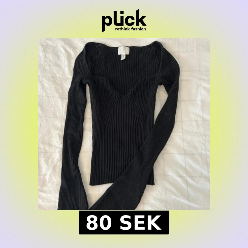 Säljer en svart ribbad långärmad topp med markerad byst och figurnära passform. Toppen har en djupare urringning och är tillverkad i stretchigt material