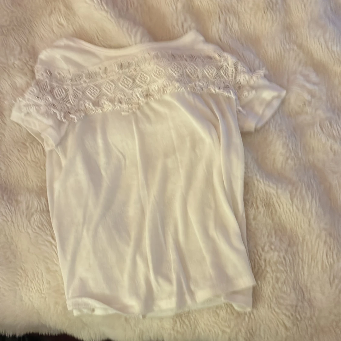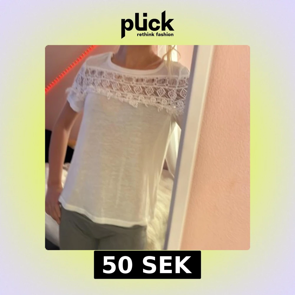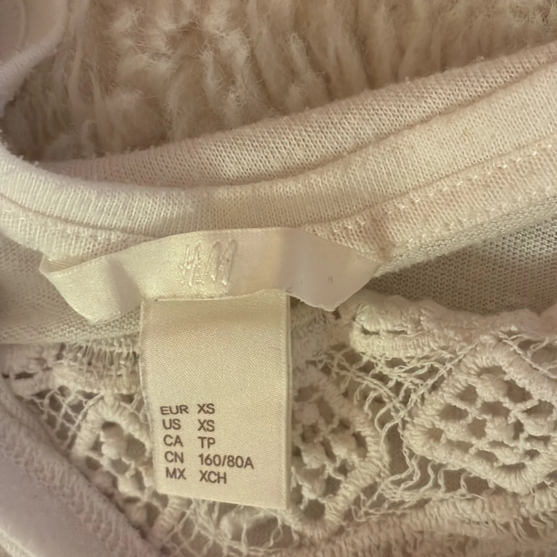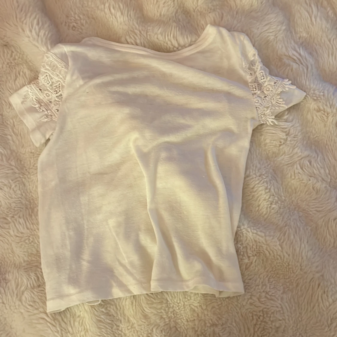 Superfin vit blus från H&M i storlek XS. Toppen har korta ärmar och en snygg spetsdetalj över axlar och bröst, vilket ger en romantisk vibe. Mjuk och lätt i materialet, perfekt till jeans eller kjol. Enkel rund halsringning och rak passform.