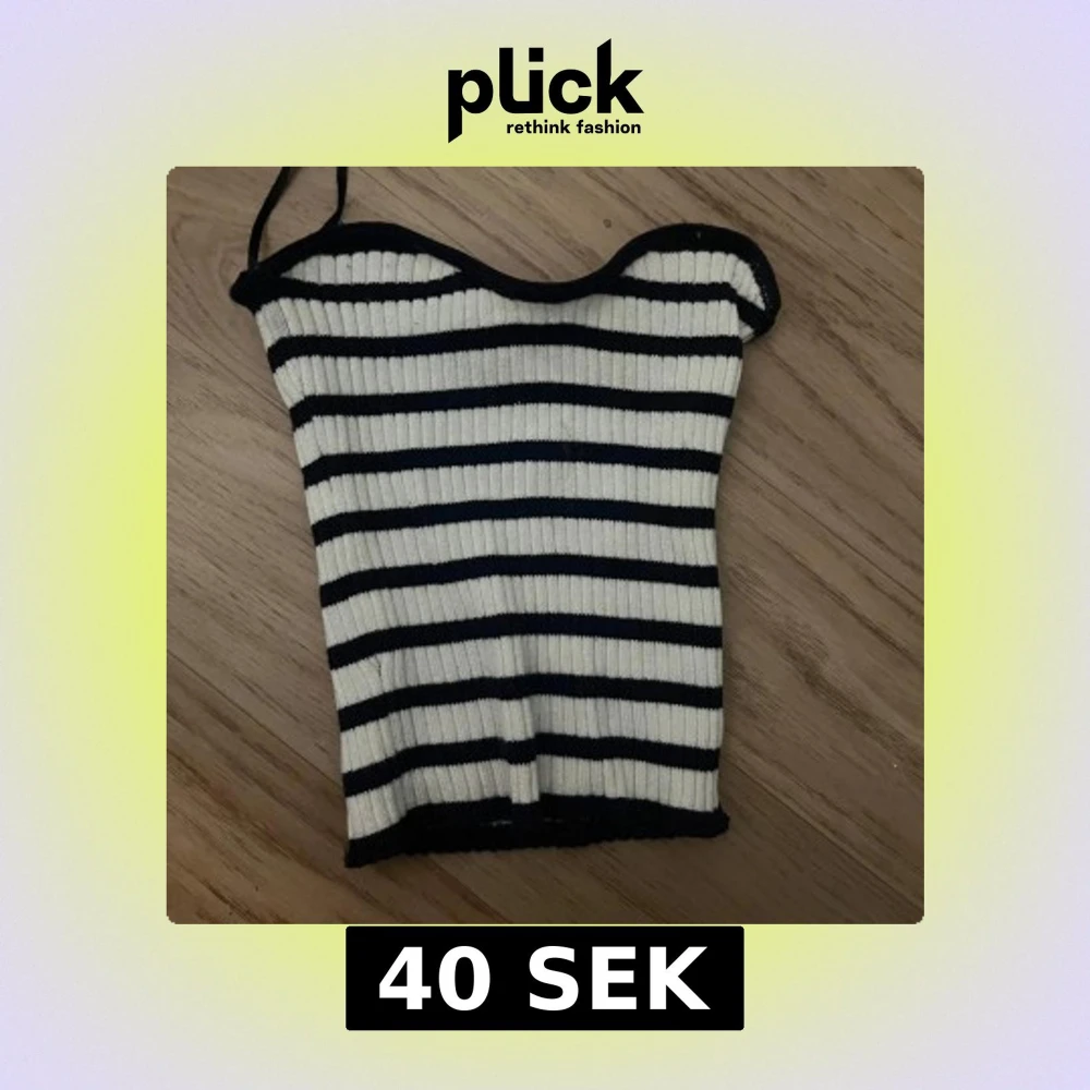 Snygg ribbad tubtopp med svarta och vita horisontella ränder. Toppen är ärmlös och har en bandeau-form med smala axelband. Perfekt för en trendig och avslappnad look under varma dagar.