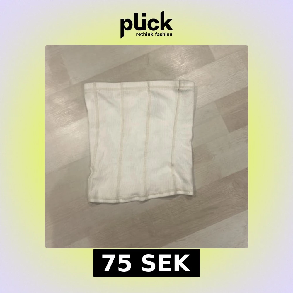 Säljer en vit ribbad tubtopp med synliga sömmar i beige. Toppen är axelbandslös och har en enkel, stilren design som är lätt att matcha. Perfekt för varma dagar eller lager på lager. Materialet är stretchigt och bekvämt. Obs! En liten fläck se bilder
