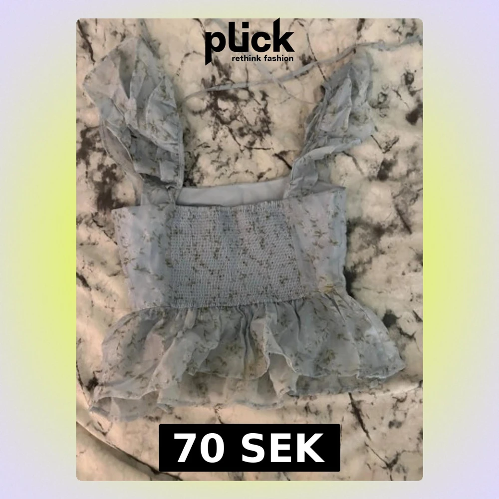 Söt ljusblå topp med blommigt mönster och volanger. Toppen har breda axelband med volangdetaljer och smockad framsida för en skön passform. Materialet är tunt och transparent, perfekt för sommarens varma dagar. Volang nedtill ger en romantisk vibe.