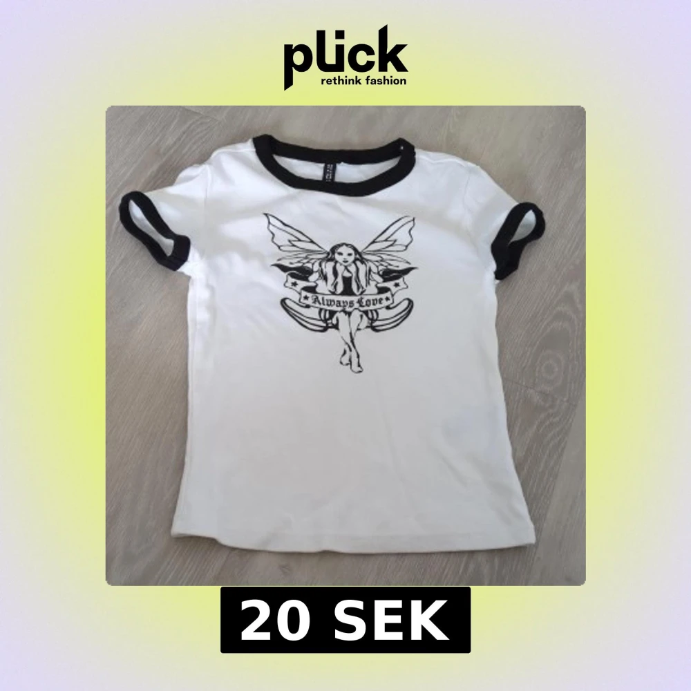 Vit t-shirt från H&M Divided med svarta kontrastkanter på ärmar och hals. Tryck framtill med en fe och texten 'Always Love' i svart. Modellen är kortärmad och i 100% bomull, perfekt för en cool och avslappnad stil.