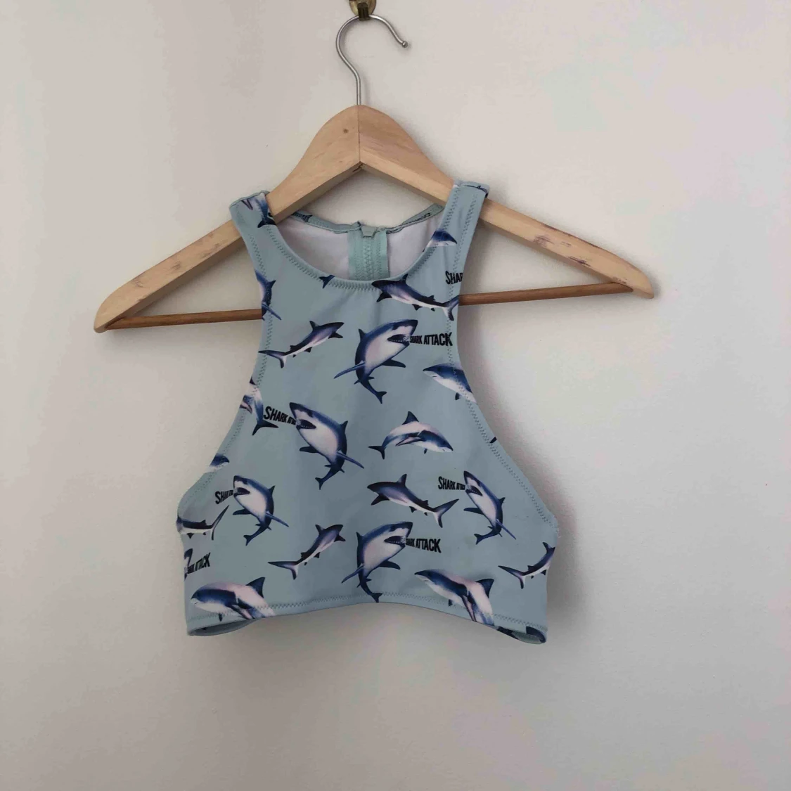 Blå bikiniöverdel med brottar-rygg och dragkedja. Motiv med hajar och texten ”shark attack”. Sparsamt använd och i bra skick! Kan mötas längst roslagsbanan eller i stockholm, annars står du för frakt.