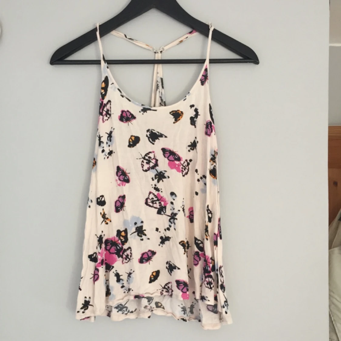 Ett ljusrosa linne i storlek 34 med fjärilsmotiv. Mysig med naturligt fall. Använt men fint skick. 33kr +frakt