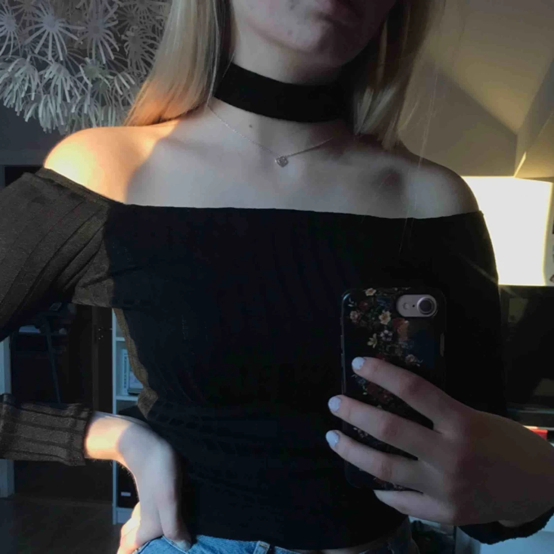 Svart ribbad offshouldertopp med choker. Använd max 3 gånger, som nyskick! Det är rätt stretchigt material