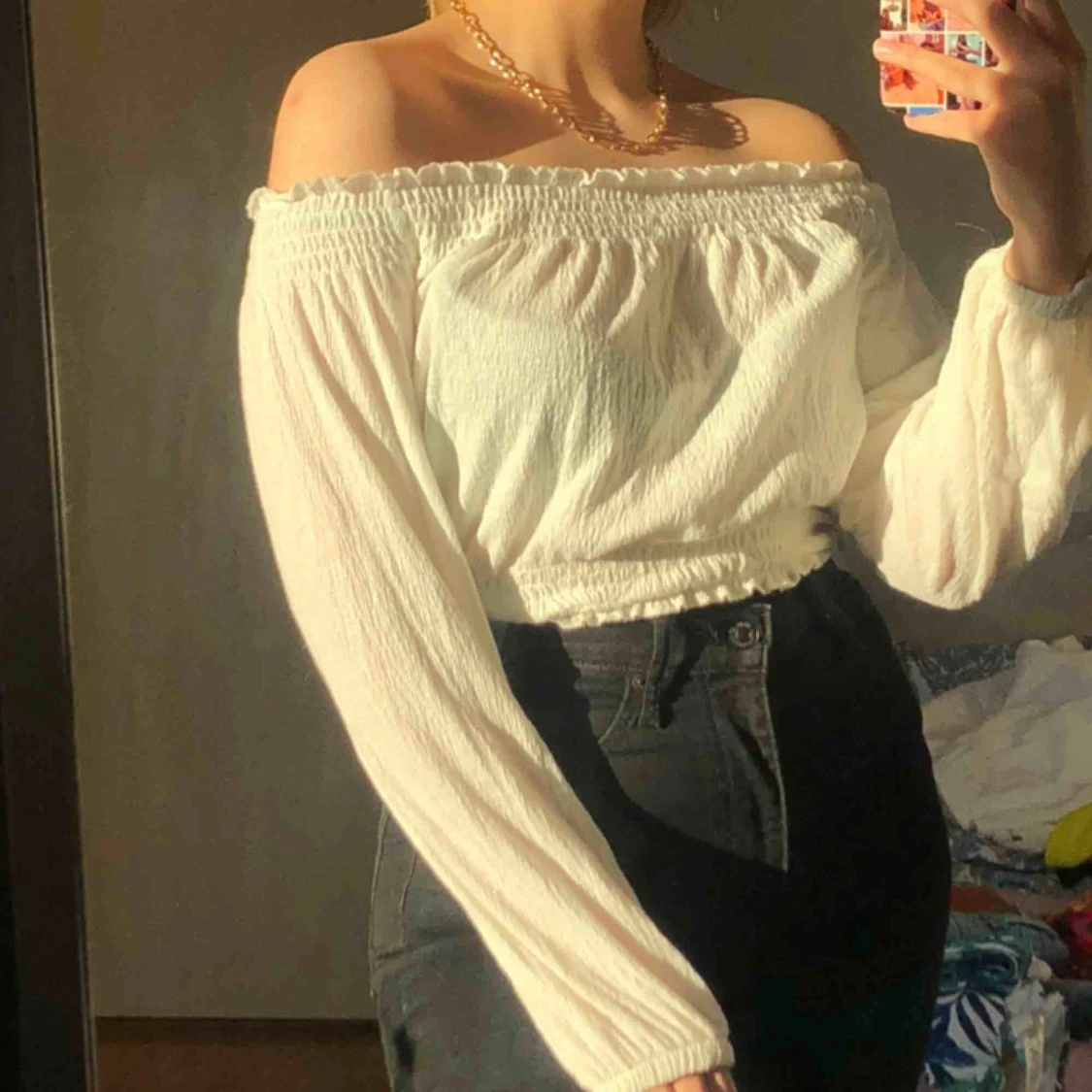 Säljer min offshoulder topp från Hm, lappen bak i tröjan är avklippt så vet inte exakt storlek men tröjan sitter som en XS/S🤍