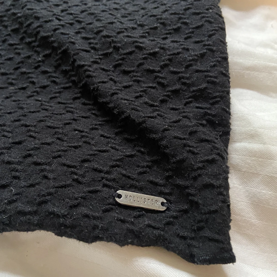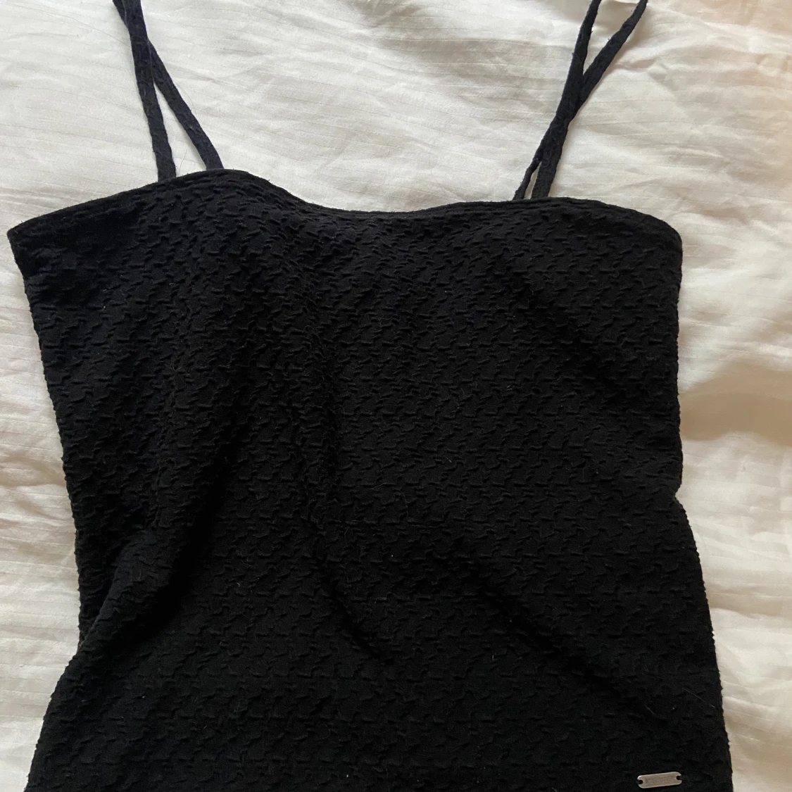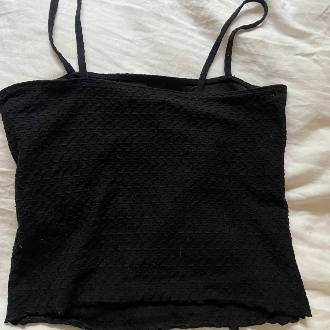 Ett svart kortare linne med fint mönster. Rätt smala axelband och en rak passform. Hel och fin bara blivit lite kort då materialet inte är stretchigt utan den sätter sig rätt tajt!