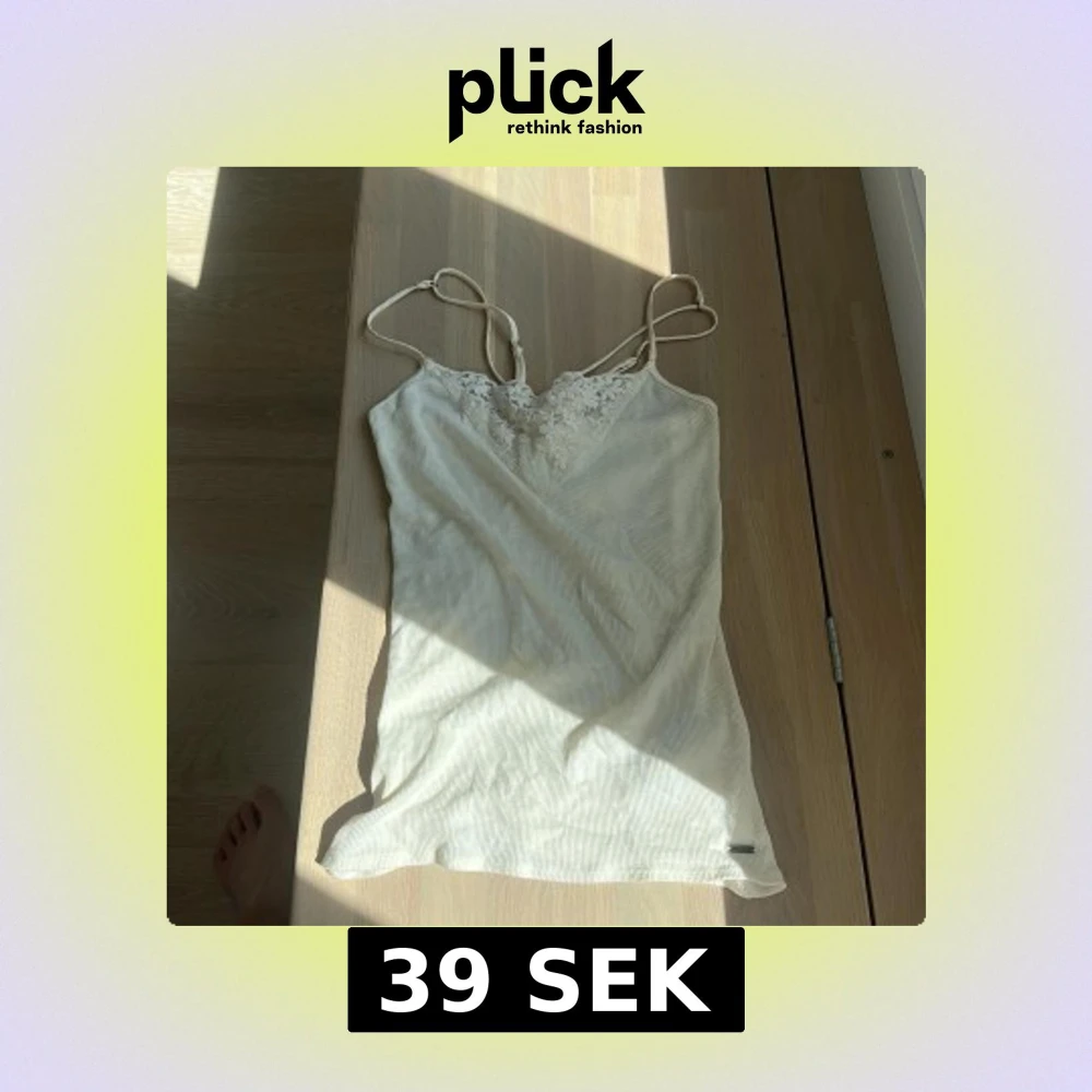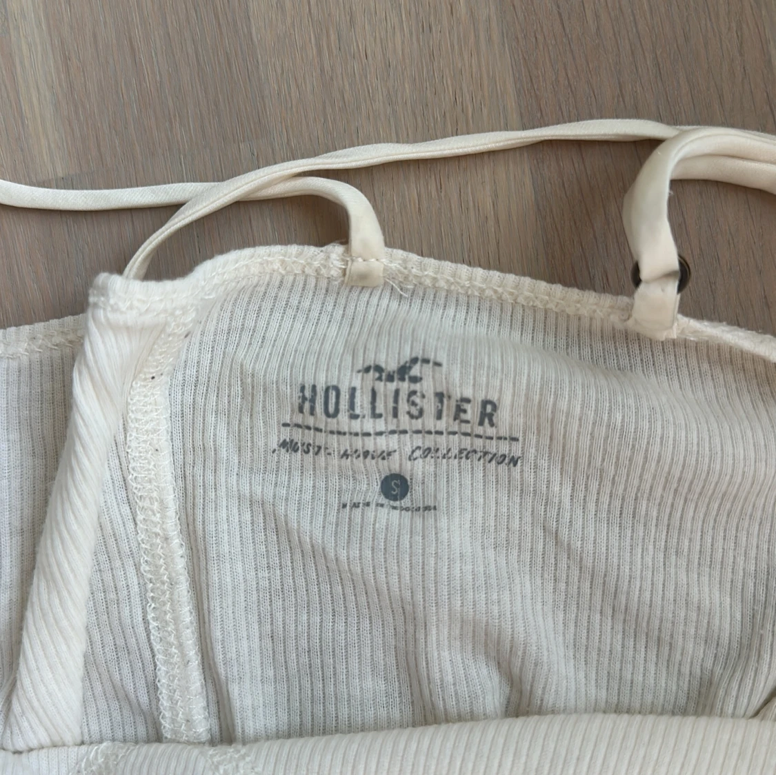 Supersöt vit ribbad linnetopp från Hollister med tunna justerbara axelband och spetsdetaljer framtill. Toppen har en v-ringad urringning med broderade blommor och är perfekt för varma dagar. Enkel att matcha med jeans eller kjol.