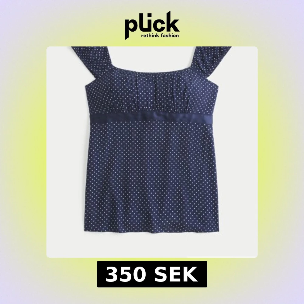 Supersöt mörkblå blus från Hollister som jag köpte i USA med vita prickar och korta ärmar. Toppen har en smockad överdel, markerad midja med ett satinband som knyts i ryggen och en fyrkantig ringning. Perfekt till jeans för en chill och trendig look. Säljer den då den inte har kommit till användning.