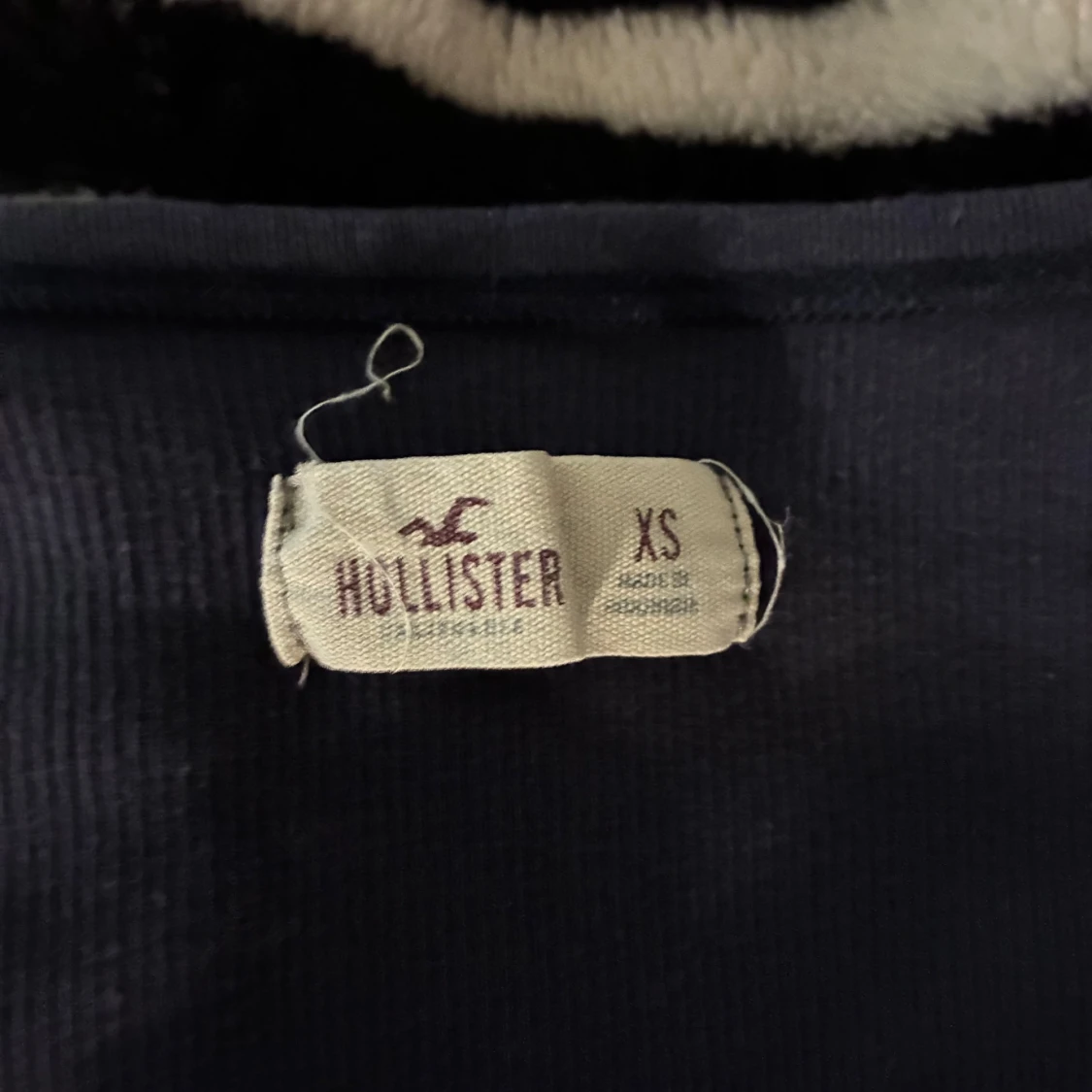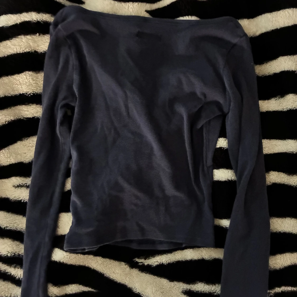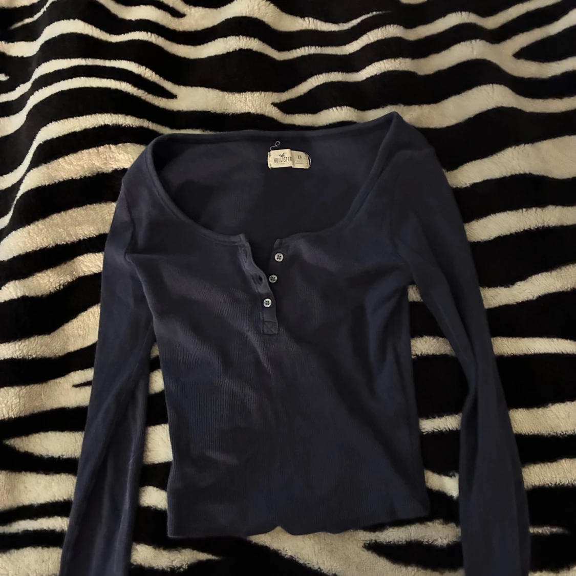 Mörkblå långärmad topp från Hollister i ribbad. Modellen har en djup v-ringning med tre knappar framtill och sitter figurnära. Perfekt att styla med jeans eller kjol för en enkel och snygg look.