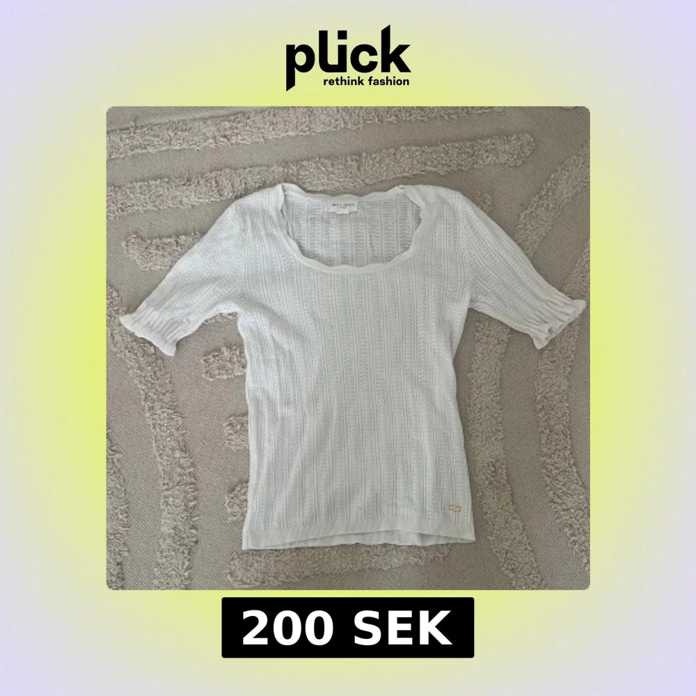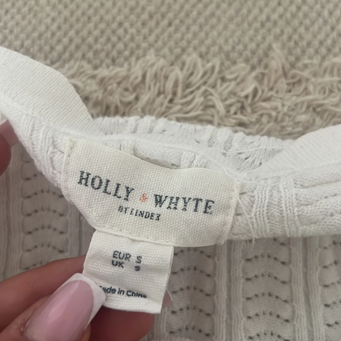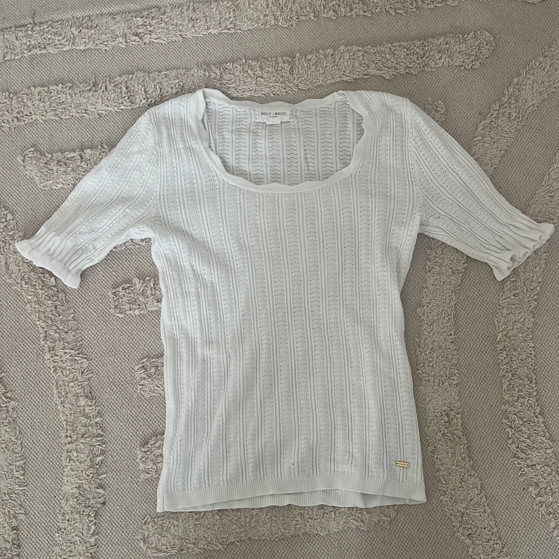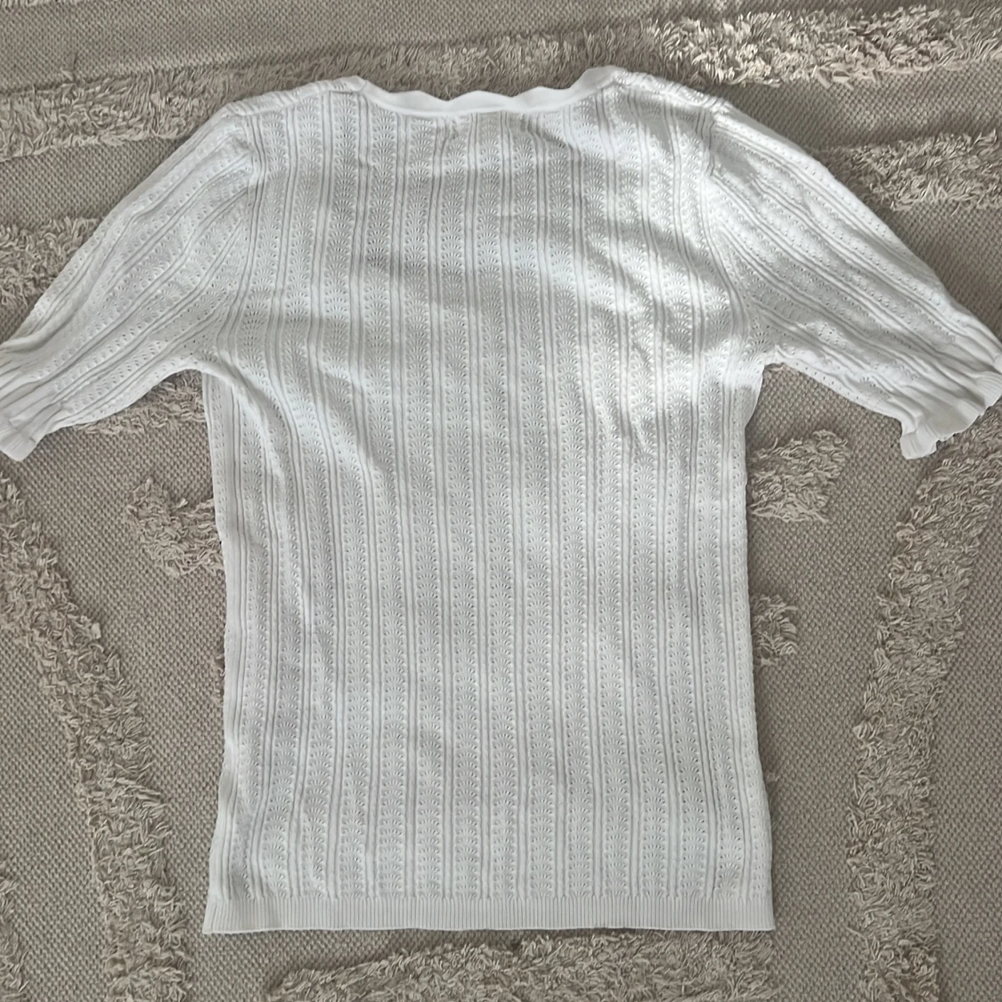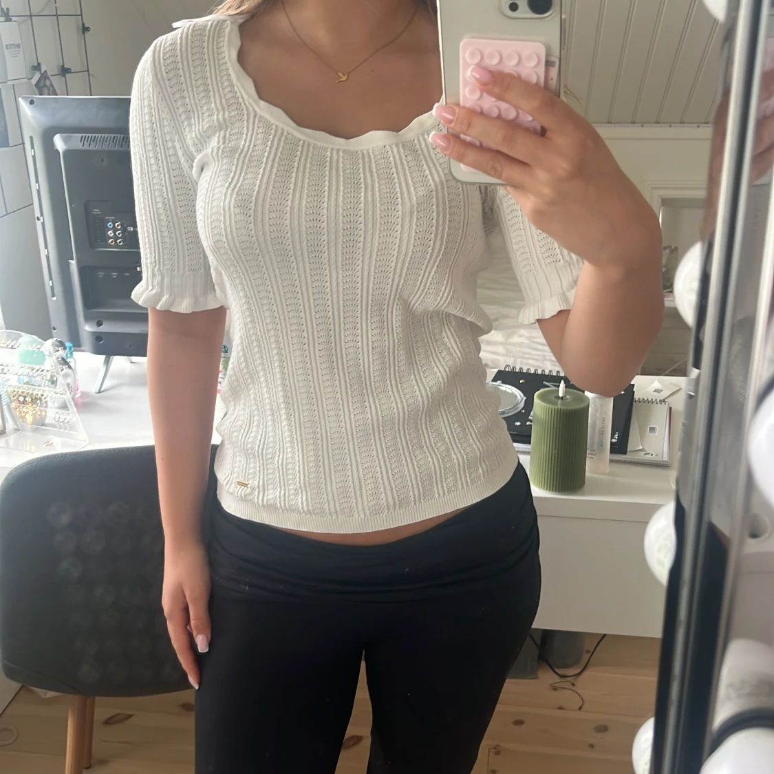 Supersöt vit stickad topp från Holly & Whyte med korta ärmar och snyggt ribbat mönster. Toppen har en rundad, lite vågig urringning och fina detaljer vid ärmsluten.