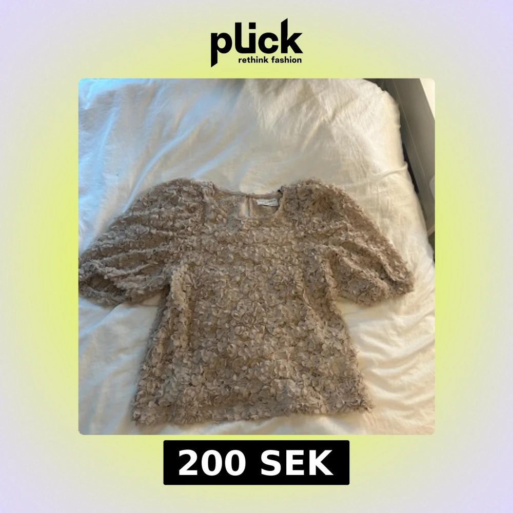 Aldrig använd. Supersöt beige blus från Holly & Whyte med 3D-blommor över hela tyget. Puffiga korta ärmar och rund halsringning. Blusen är i spets🥰Passar även S och M😗