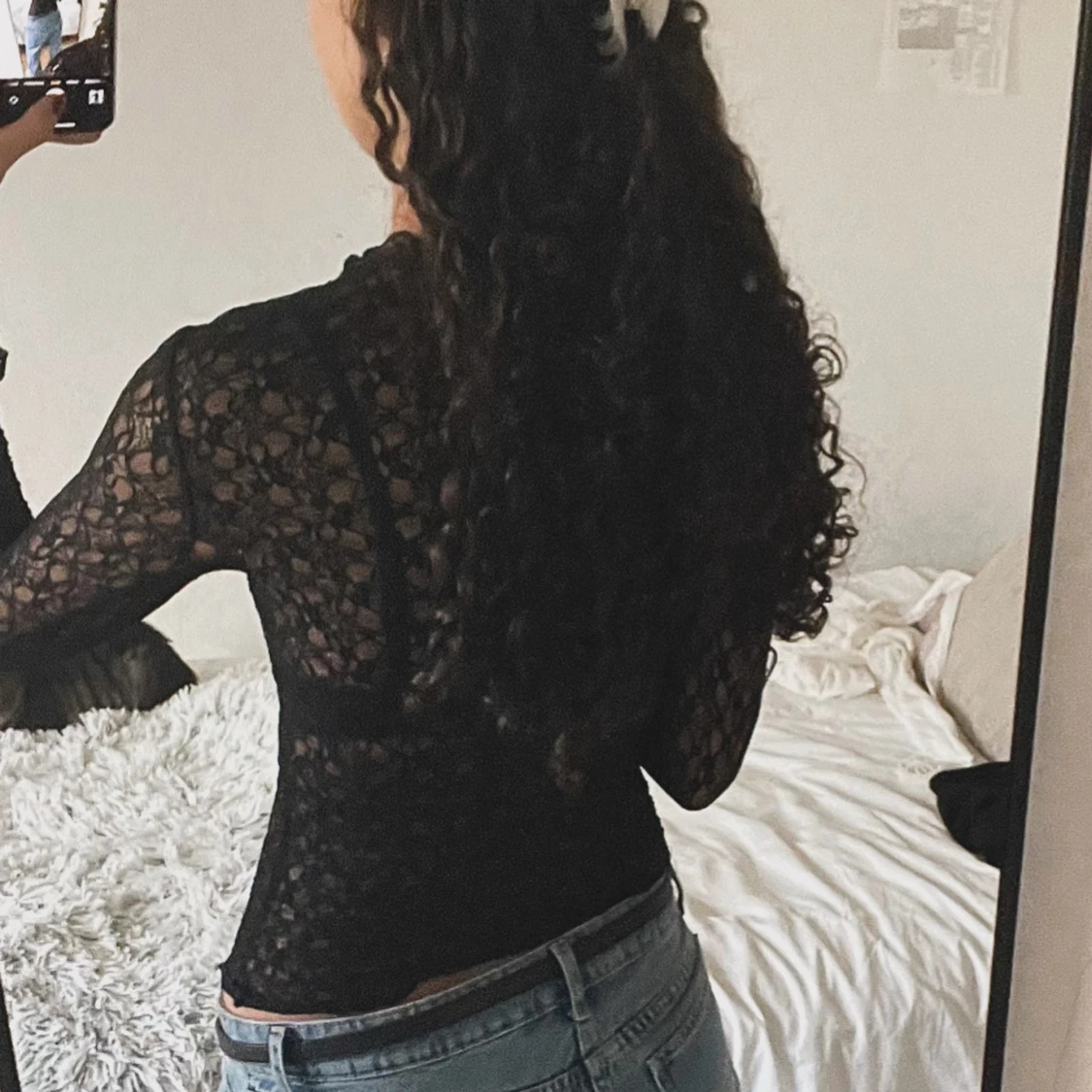 Säljer en svart spetsblus. Blusen har långärmade, utsvängda ärmar och figurnära passform. Perfekt att styla med jeans eller kjol för en festig look.