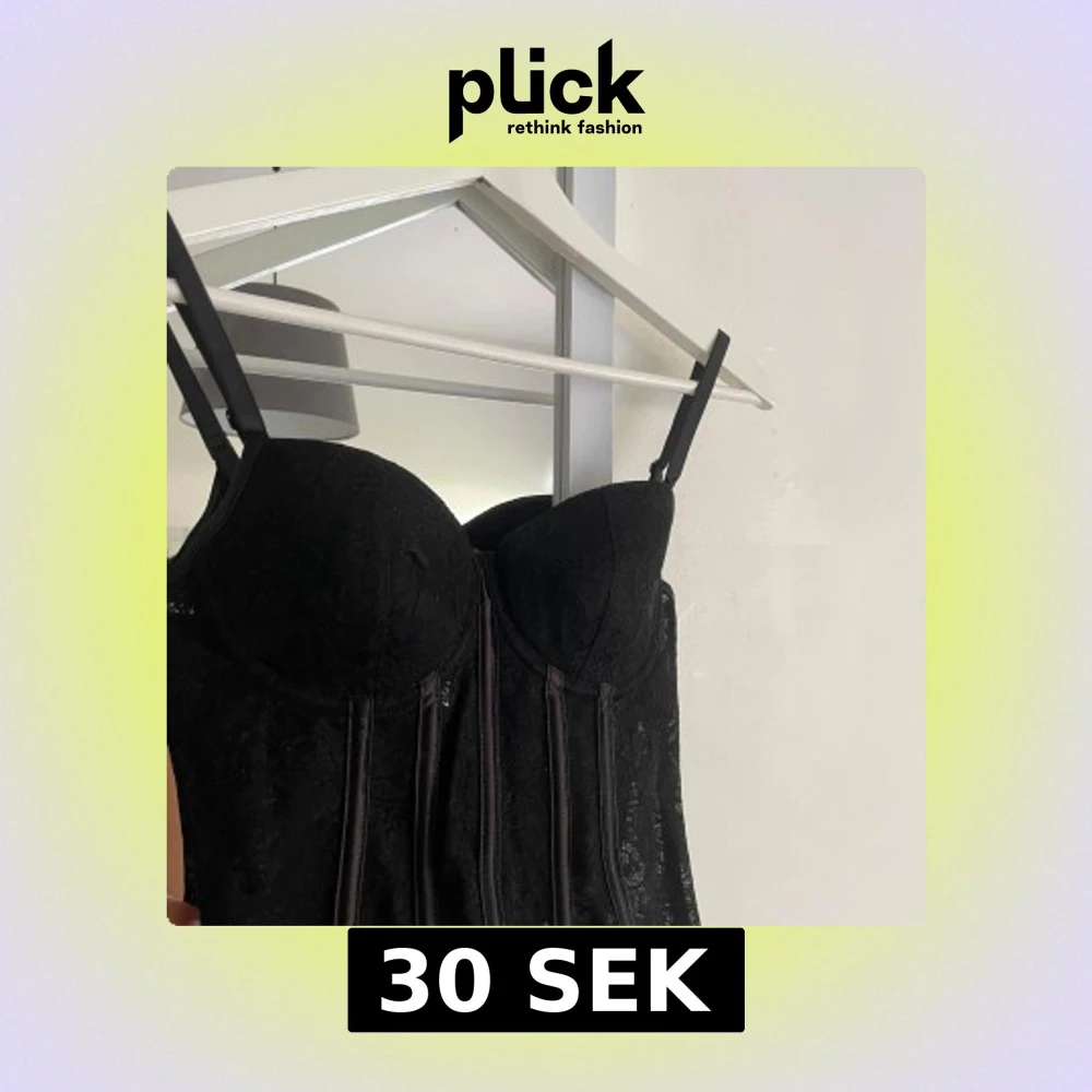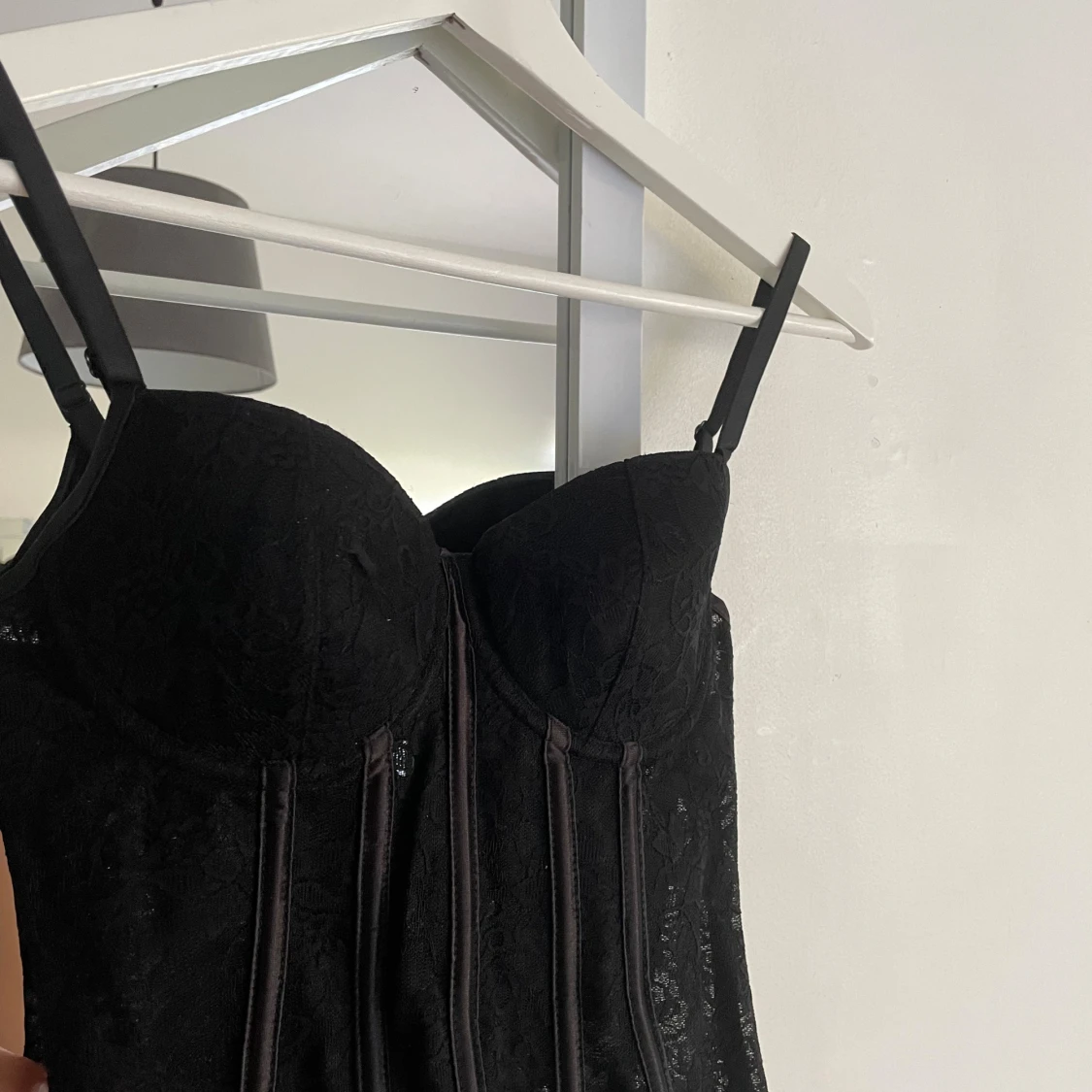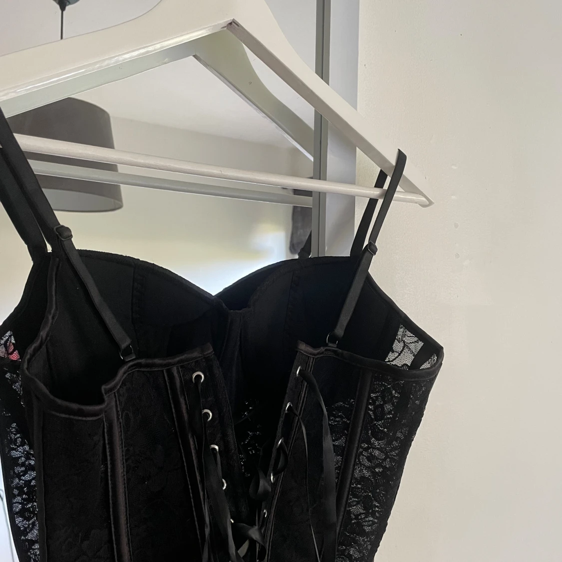 Säljer en svart korsett med justerbara axelband och snygga spetsdetaljer. Toppen har markerade kupor och dekorativa sömmar framtill. Baksidan har snörning för att kunna anpassa passformen. Perfekt för dig som vill ha en edgy och trendig look.