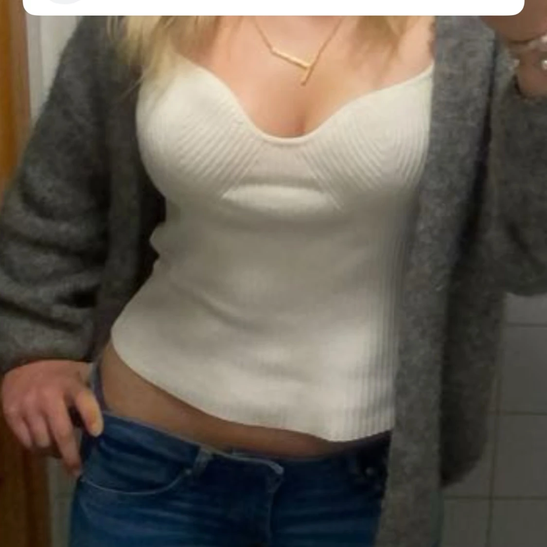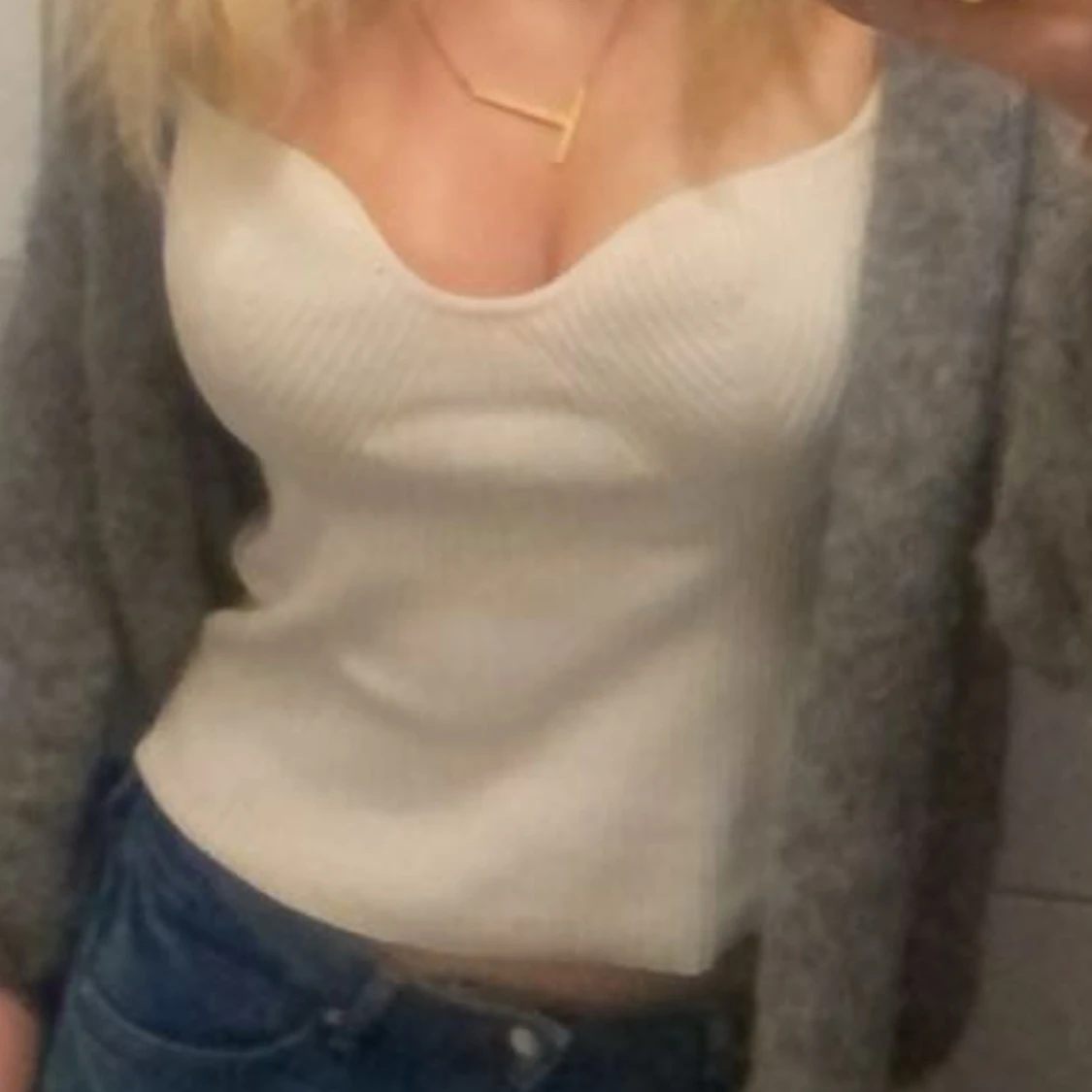 Säljer en vit ribbad linnetopp med snygg v-ringning och croppad passform. Toppen är ärmlös och har en lätt vågig nederkant som ger en cool touch. Perfekt att styla med jeans eller kjol för en fräsch look.