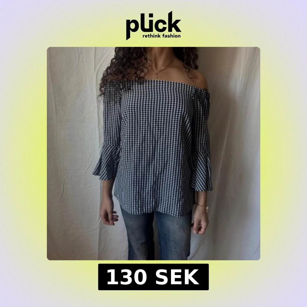Offshoulder rutig blus med volangärm