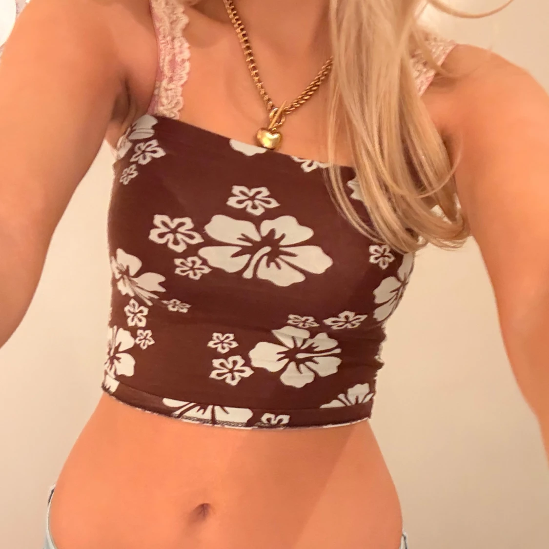 Säljer en brun croppad linnetopp med vita stora blommor. Toppen har tunna axelband i spets och sitter tight mot kroppen. Perfekt för sommarens varma dagar och ger en riktigt trendig Y2K-vibe.