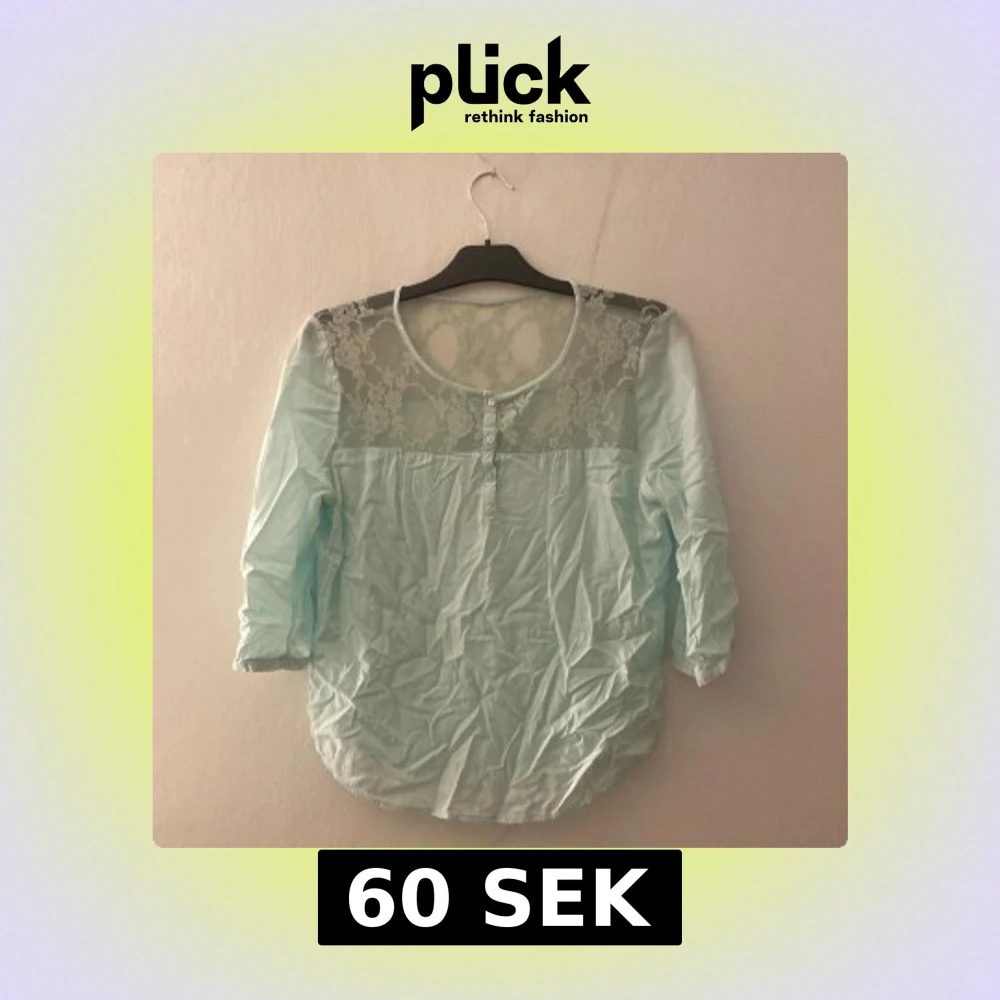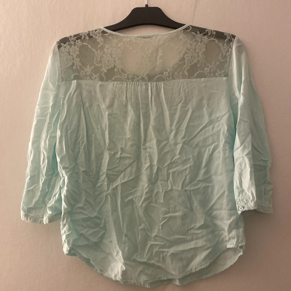 Säljer en ljusblå blus med transparent spets upptill och knappar framtill. Blusen har trekvartsärm och rund halsringning. Spetsen har ett blommigt mönster som ger en romantisk vibe. Perfekt för dig som gillar feminina detaljer och en luftig känsla.⚠️finns ingen lapp men den passar mig som har storlek XS eller S. Den är skrynklig eftersom den legat i min byrålåda