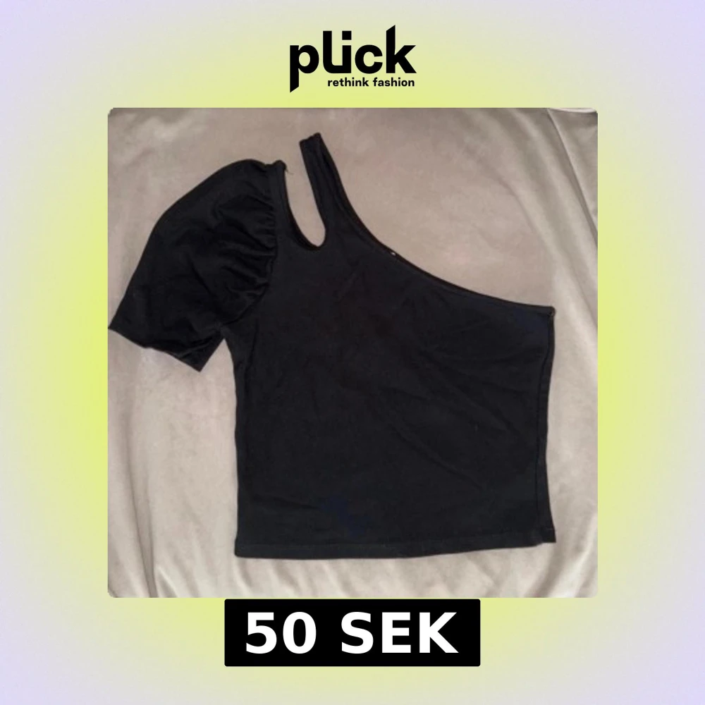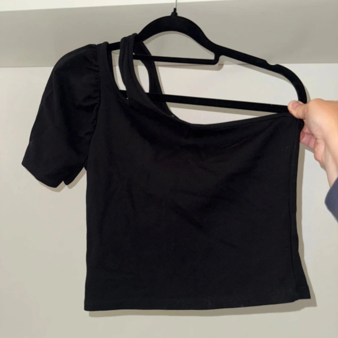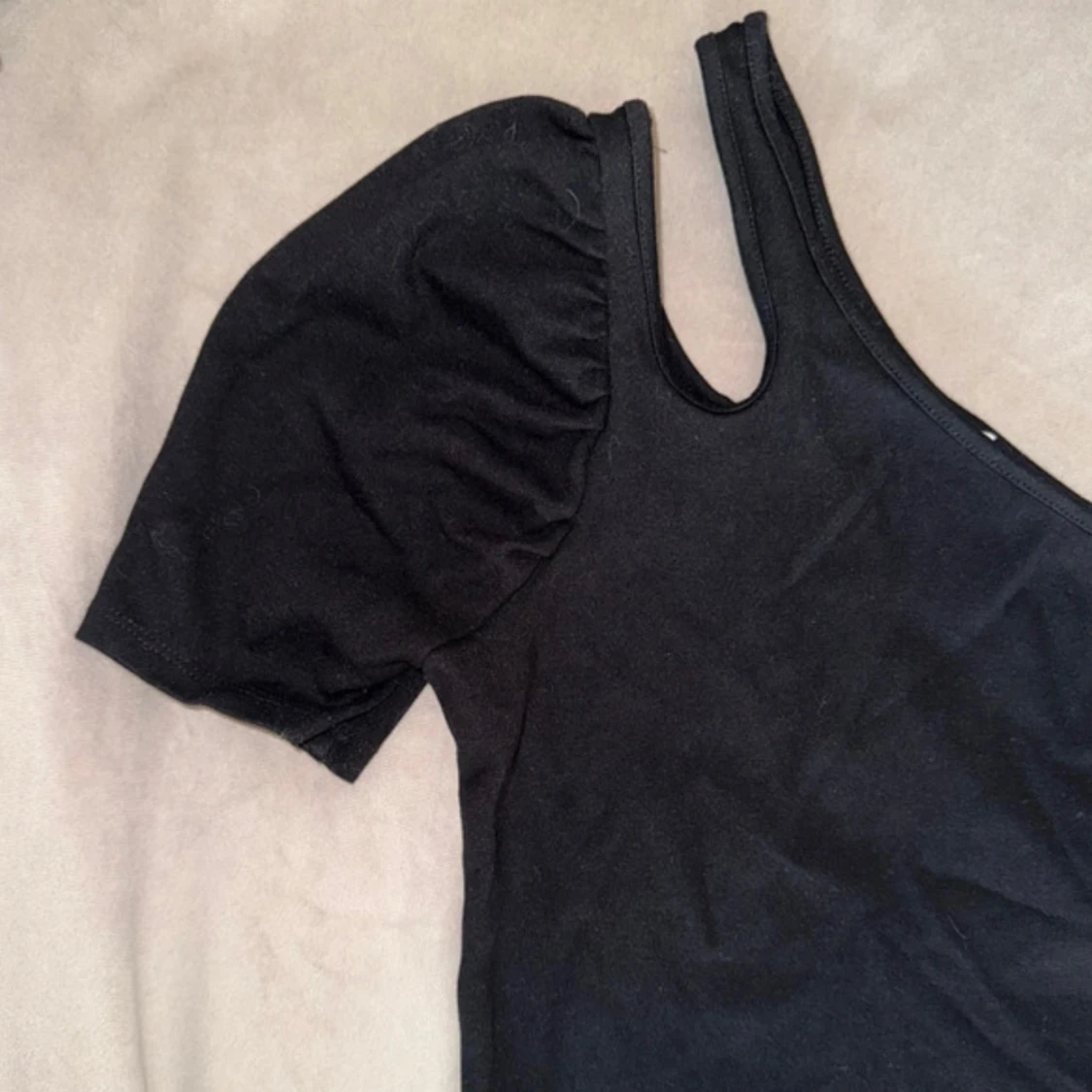 Säljer en svart oneshoulder topp med en kort puffärm på ena sidan och axelbandslös på andra. Toppen är croppad och har en stilren, asymmetrisk design som ger en cool vibe. Perfekt att styla med höga jeans eller kjol. Toppen är i mycket fint skick!