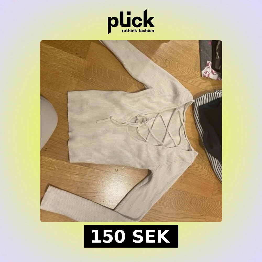 Säljer en ljus, ribbad långärmad topp med snygg snörning framtill i v-ringad design. Toppen har en croppad passform och är tillverkad i mjukt material som sitter skönt. Perfekt för dig som gillar trendiga detaljer och stilren look.