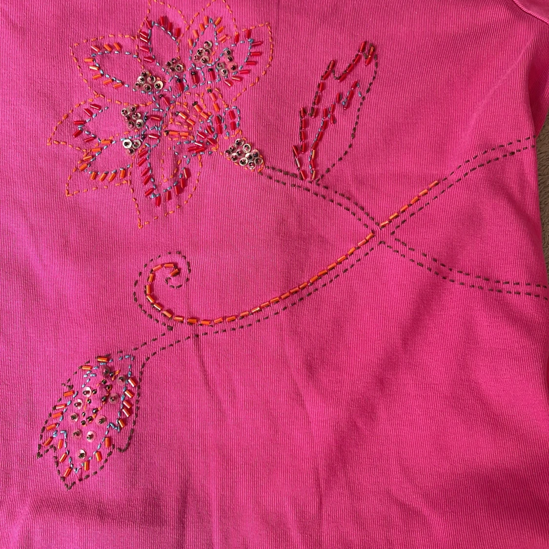 Superfin rosa t-shirt från Marks & Spencer med broderad blomma och paljettdetaljer framtill. Mjuk och skön i bomull, kortärmad och med lätt utställd passform. Perfekt för dig som vill sticka ut med färg och detaljer!