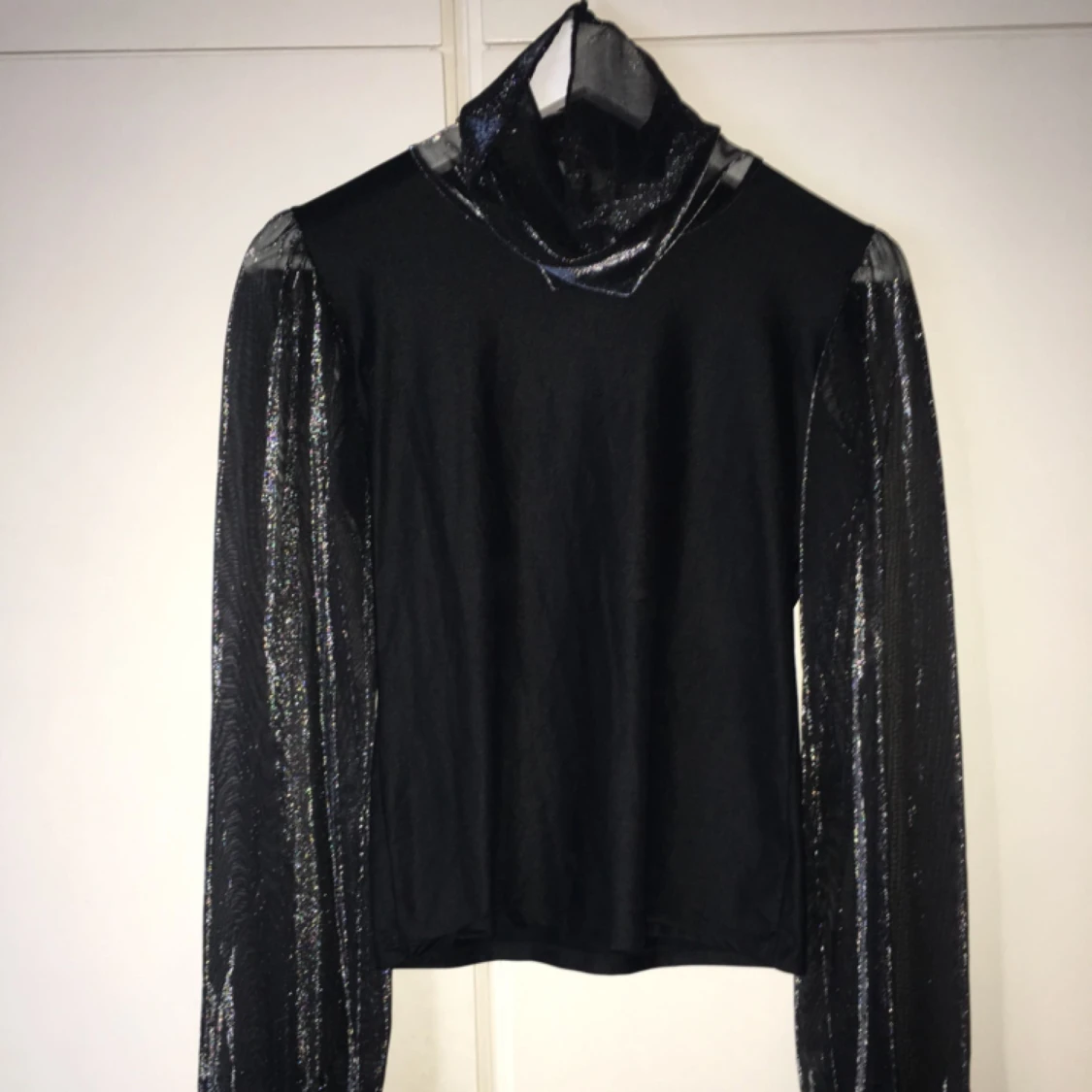 Åtsittande tröja. Ärmarna är av lite längre, svepande, glittrigt tyg.