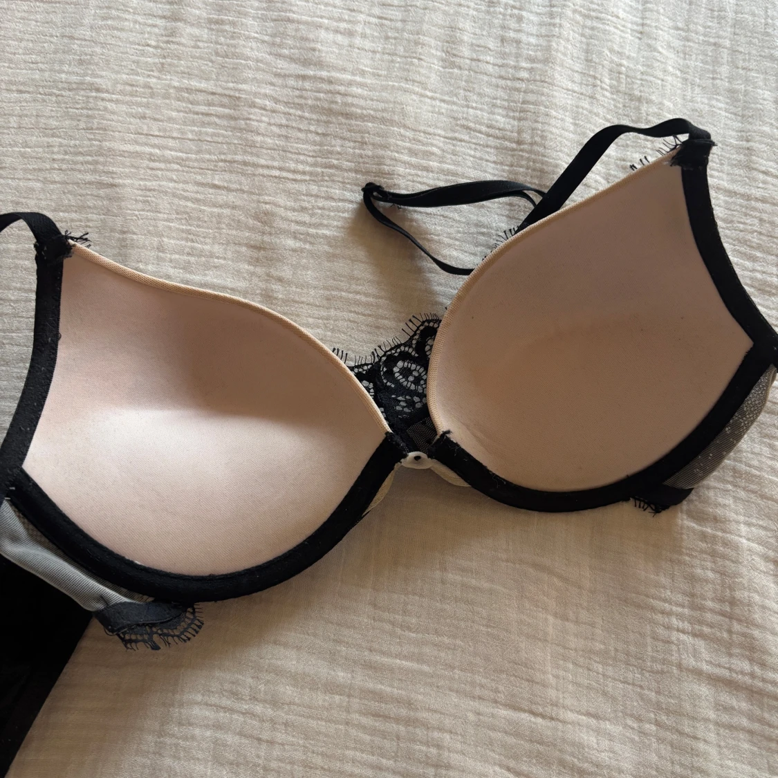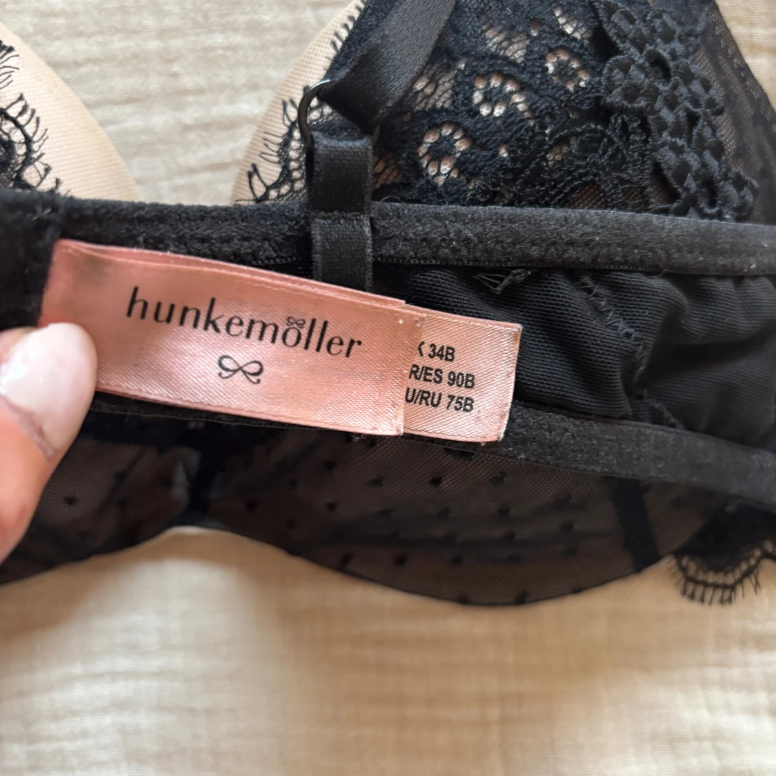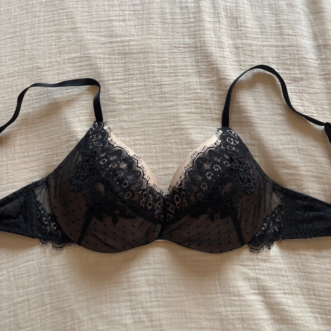 Elegant svart push up bh från Hunkemöller med vacker spetsdetalj och prickigt mönster. Den har justerbara axelband och en mjuk insida för extra komfort. Perfekt för att känna sig både bekväm och stilfull.