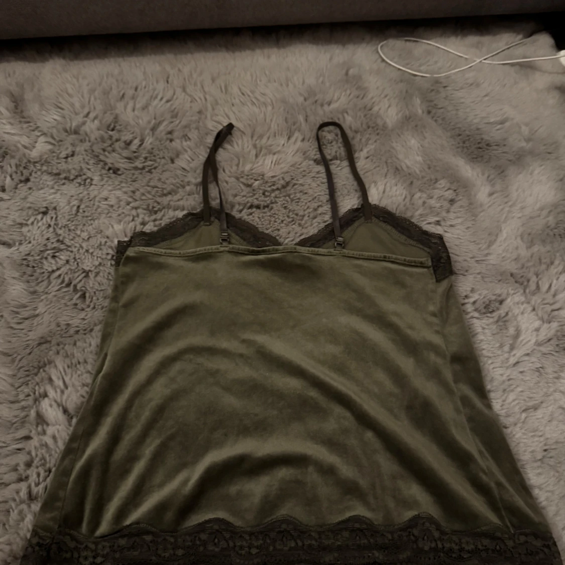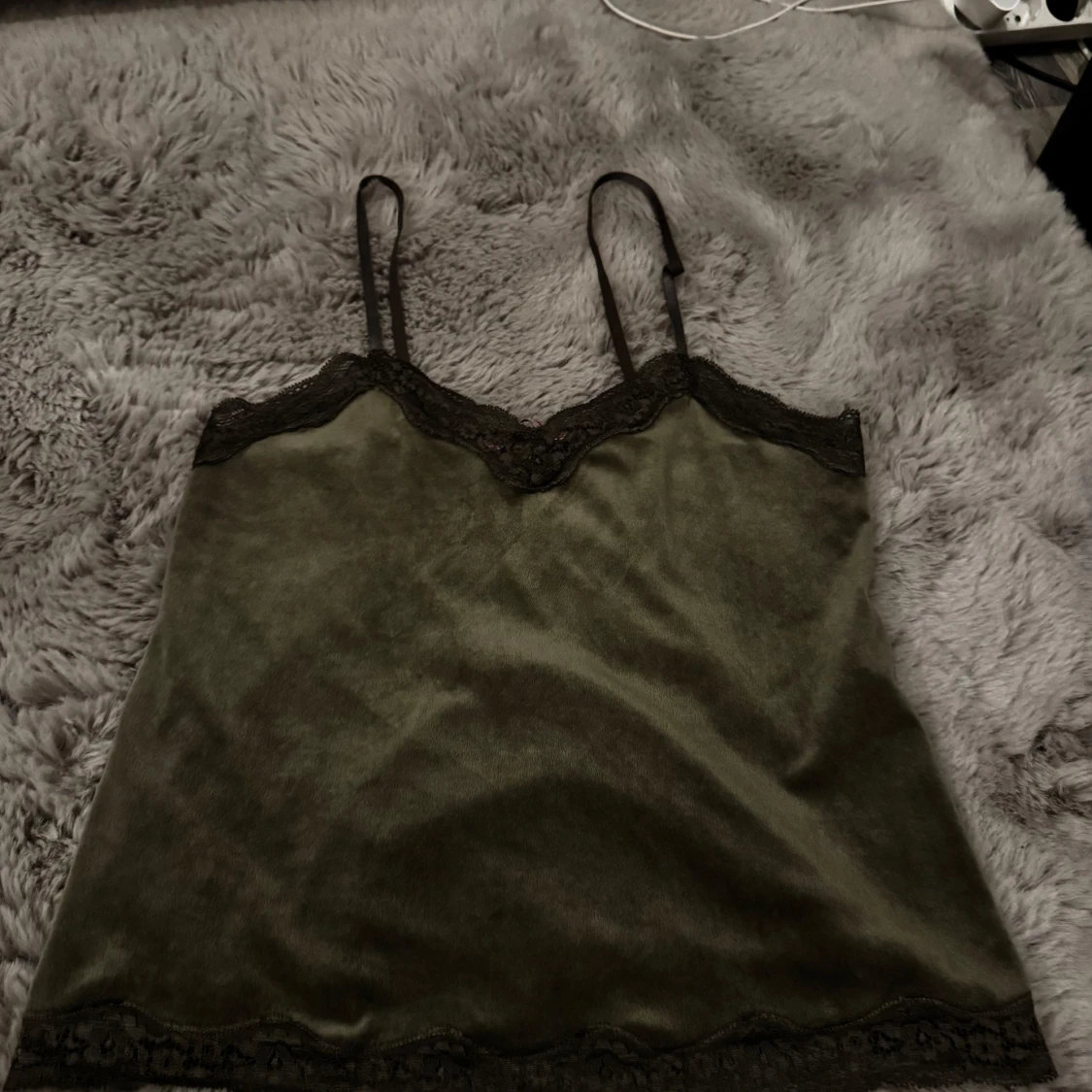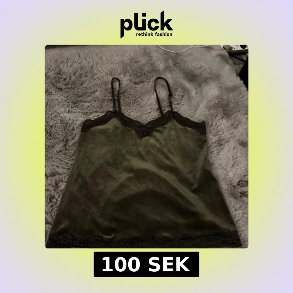 Snygg olivgrön linnetopp i mjuk sammet / velour med tunna axelband och svarta spetsdetaljer längs både halsringning och nederkant. Perfekt för dig som gillar en stilren men ändå lite lyxig look. Från Hunkemöller i storlek S