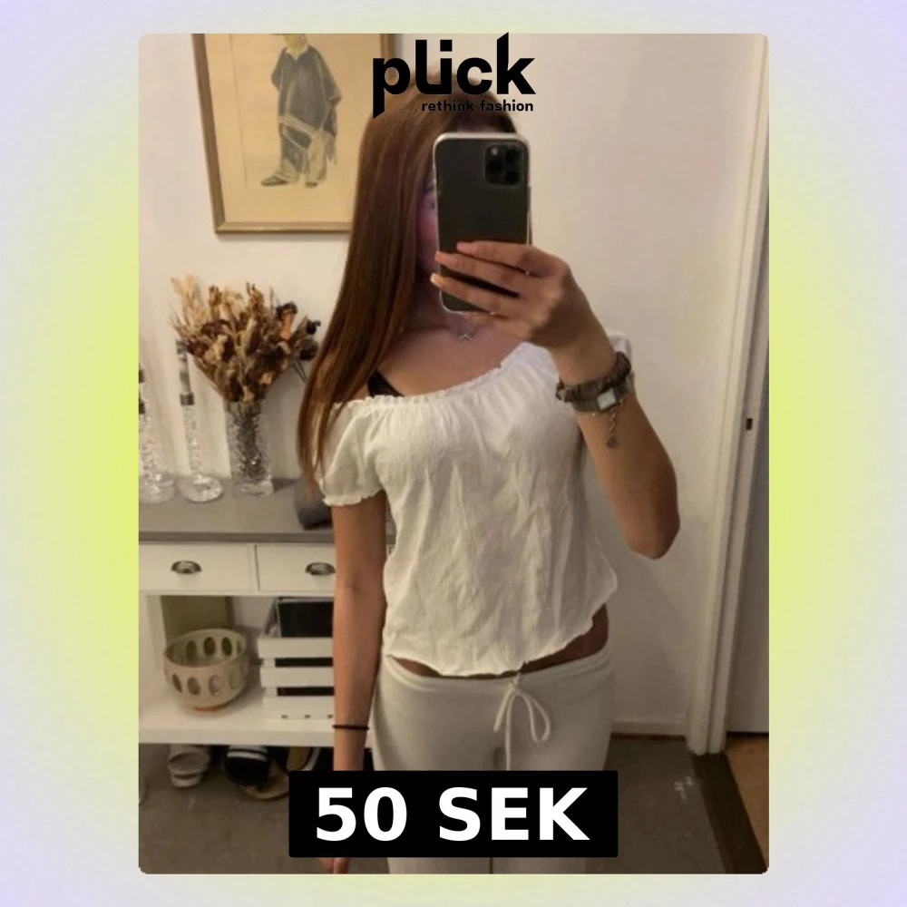 Säljer en söt vit offshoulder topp i bomull med korta ärmar och lätt rynkad resår vid halsringningen. Toppen är croppad och har en avslappnad passform, perfekt för varma dagar.