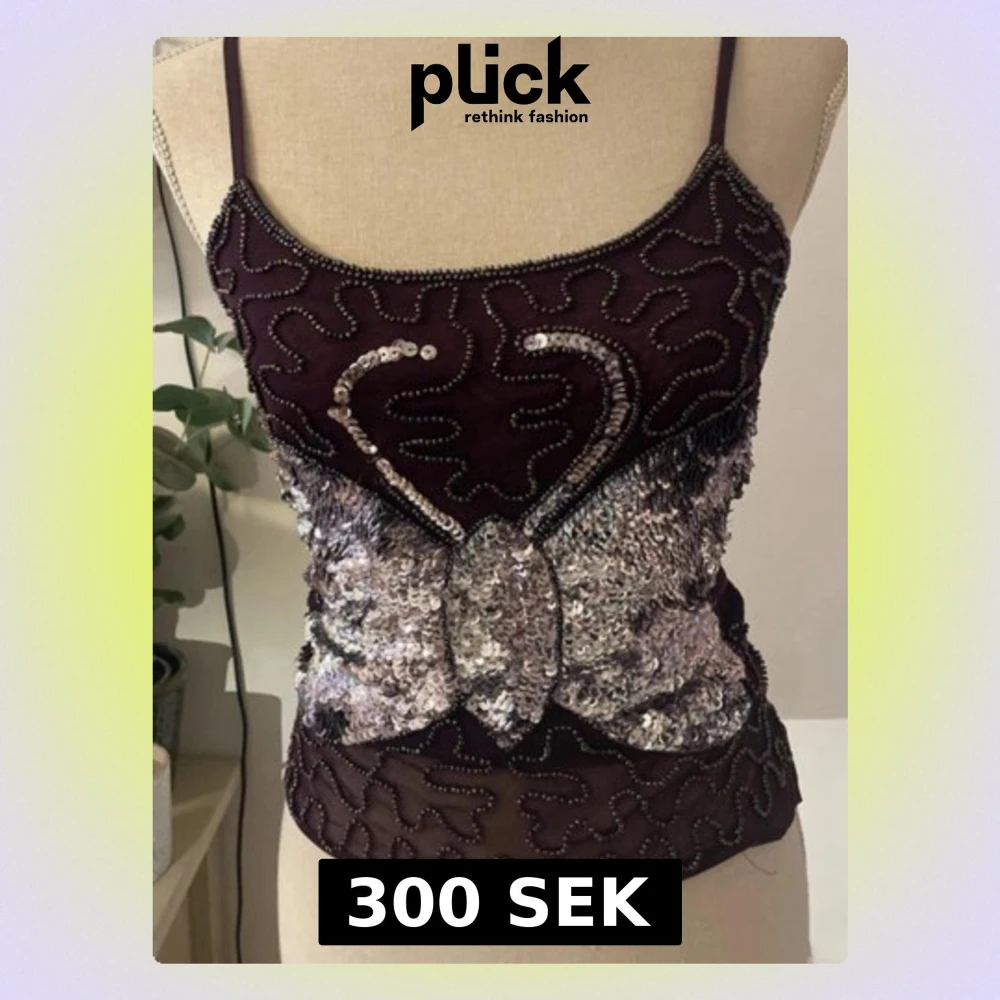 Säljer en mörklila linnetopp med tunna axelband och ett stort fjärilsmotiv framtill, täckt av glittrande silverpaljetter. Toppen har transparent mesh och dekorativa pärlbroderier i abstrakta former. Perfekt för dig som vill sticka ut med en unik och glittrig look. (Några pärlor saknas syns på sista bilden på sidan av toppen men inget man tänker på )💜💜