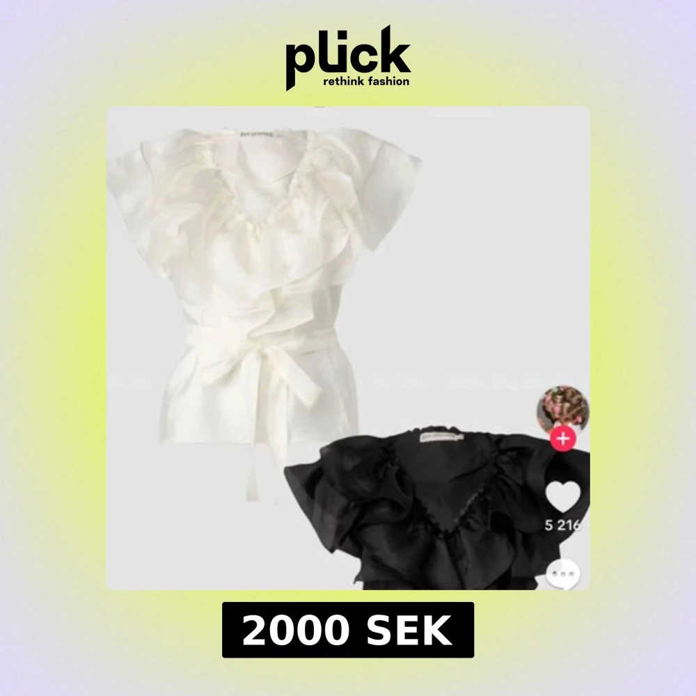 Två romantiska blusar från Ida Sjöstedt, en i vitt och en i svart. Båda har volanger längs v-ringningen och axlarna samt ett knytband i midjan. Perfekt för dig som gillar feminina detaljer och flowy siluett.