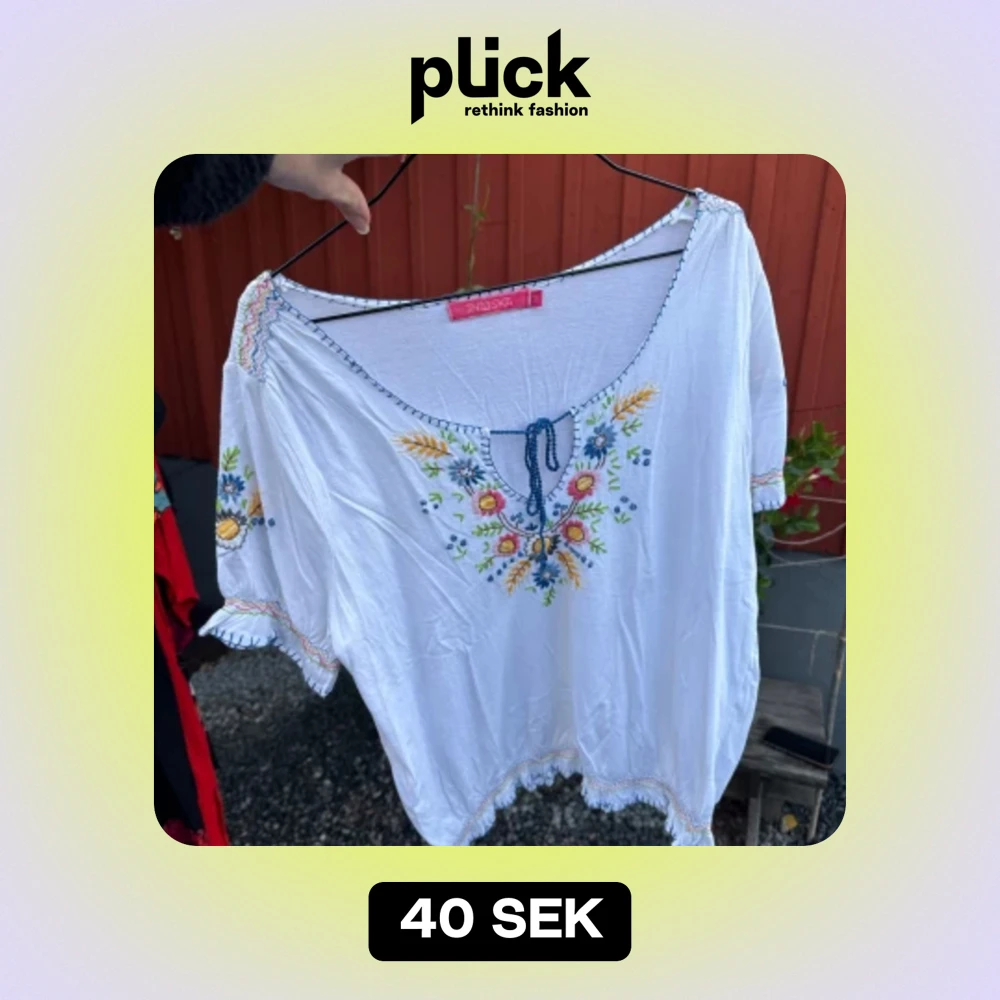 Säljer en superfin vit blus från Indiska med färgglada broderade blommor på framsidan och ärmarna. Blusen har korta ärmar och en söt knytning vid halsen. Perfekt för en somrig look!