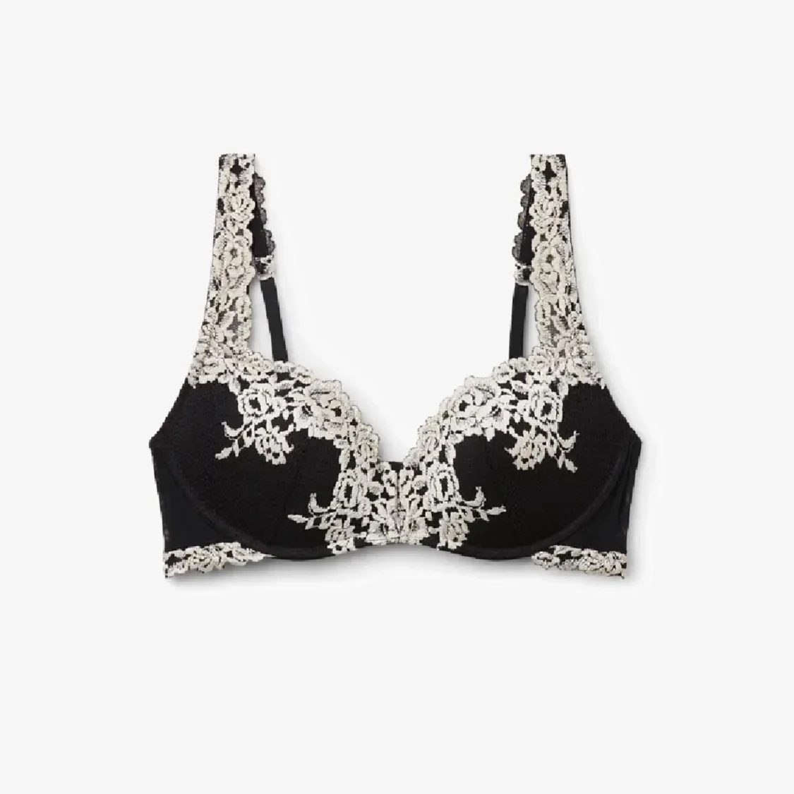 Supersnygg svart Intimissimi bh med krämvit spets som ger en lyxig och romantisk vibe. Den har formade kupor och breda axelband med spets, perfekt för att lyfta din outfit. Spetsen har ett blommigt mönster som gör bhn extra unik och feminin.