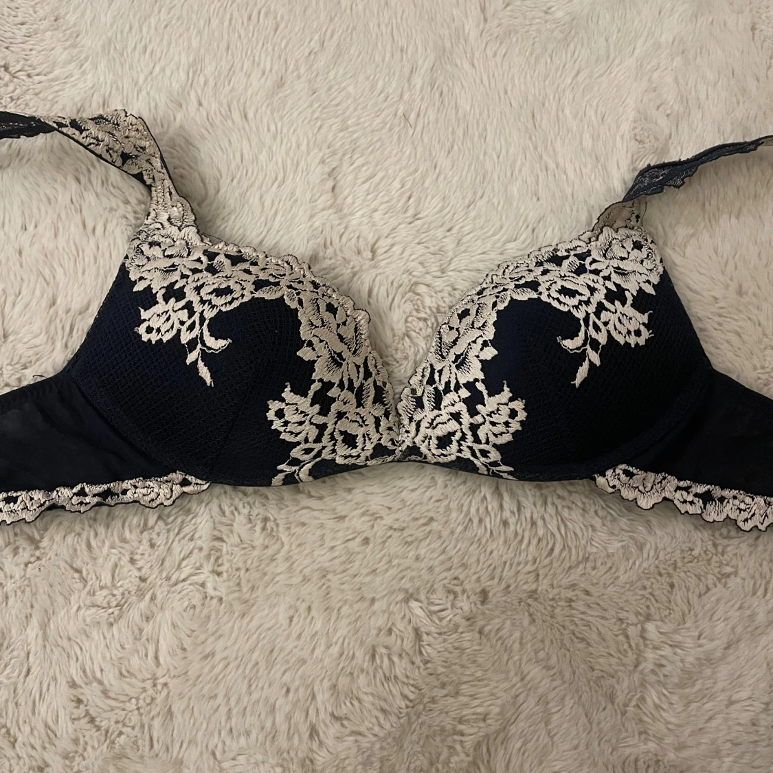 Säljer en mörkblå bh med vacker ljus spets och broderade blommor över kuporna. Bh:n har justerbara axelband och hakknäppning bak. Materialet är mjukt och bekvämt, perfekt för dig som gillar en feminin och elegant look.