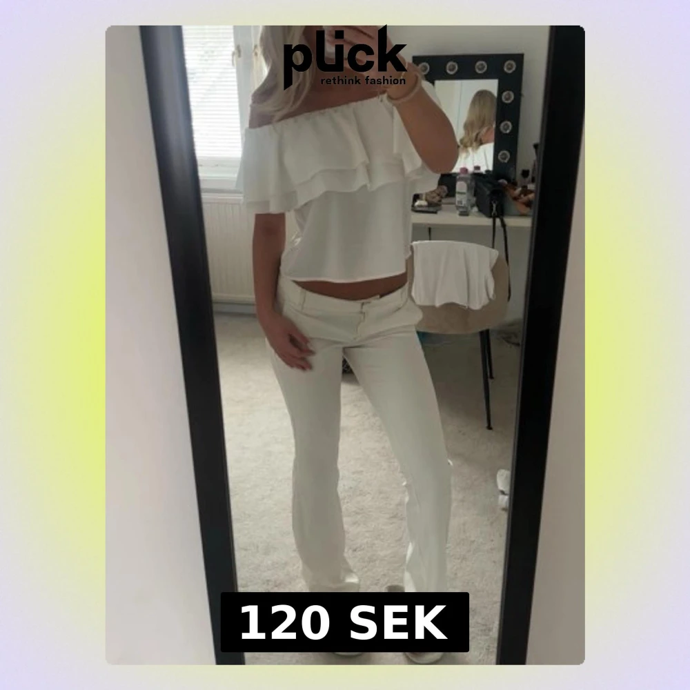 Säljer en superfin vit offshoulder topp med bred volang runt hela axelpartiet. Toppen är från Gina tricot och är i storlek XS💓💓