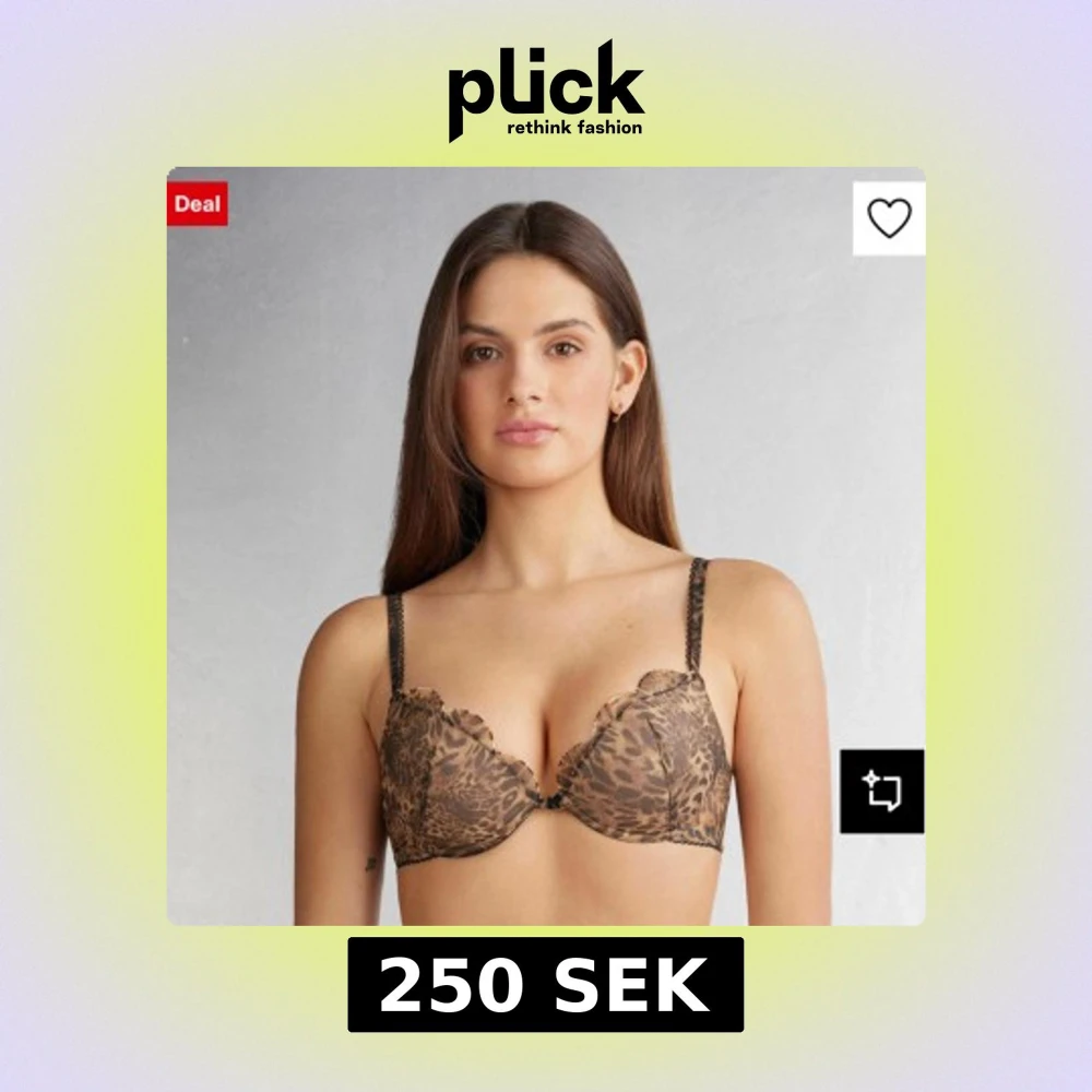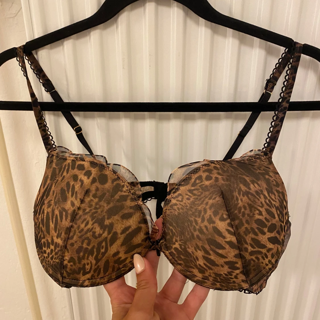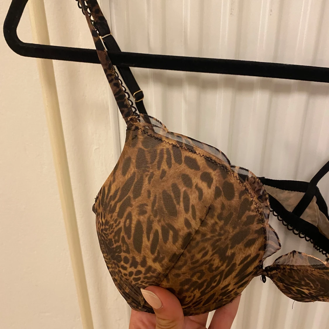 Snygg bh med leopardmönster i bruna och svarta toner. Axelbanden är justerbara och har fina spetsdetaljer. Kuporna har lätt volangkant upptill. Bhn är i modellen simona ifrån intimissimi. Så mycket push up. Org priset är runt 500. Använd en gång