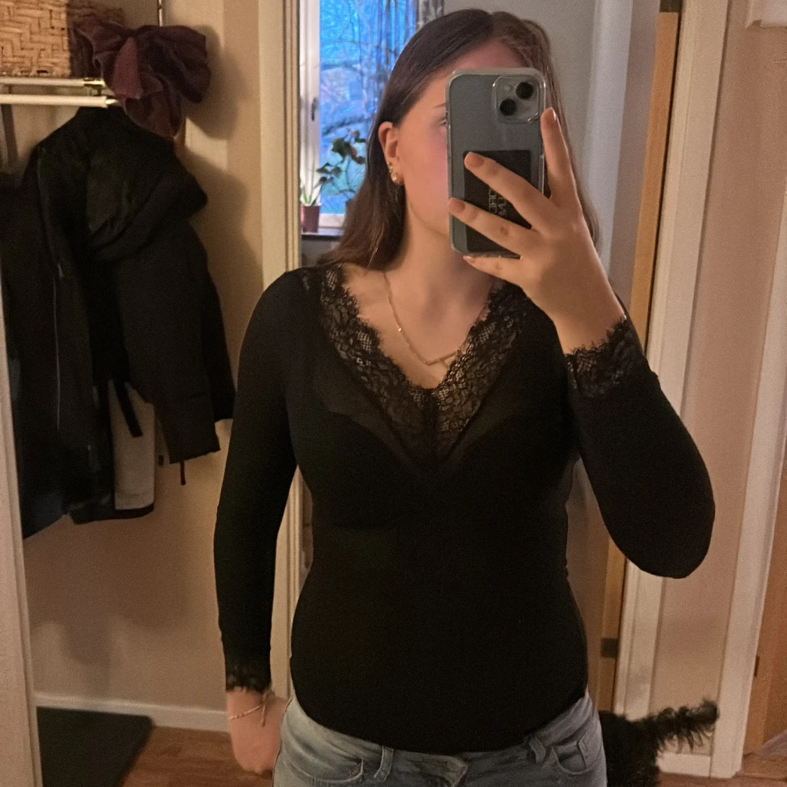 Svart långärmad topp från Intimissimi med v-ringning och fina spetsdetaljer vid halsringning och ärmslut. Den har bra kvalitet och jag har haft den i ett år men bara används ett fåtal gånger,därav säljer jag den💗