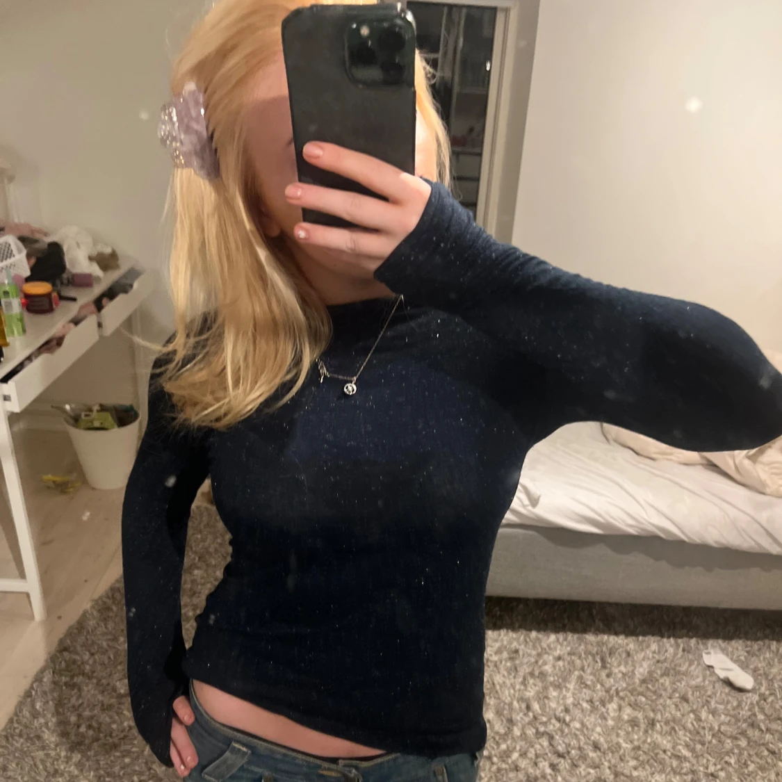 Säljer en mörkblå långärmad topp med glittriga detaljer. Toppen är tight och har en rund halsringning, perfekt för att ge en snygg och stilren look. Passar dig som gillar att sticka ut lite extra med diskret glitter.