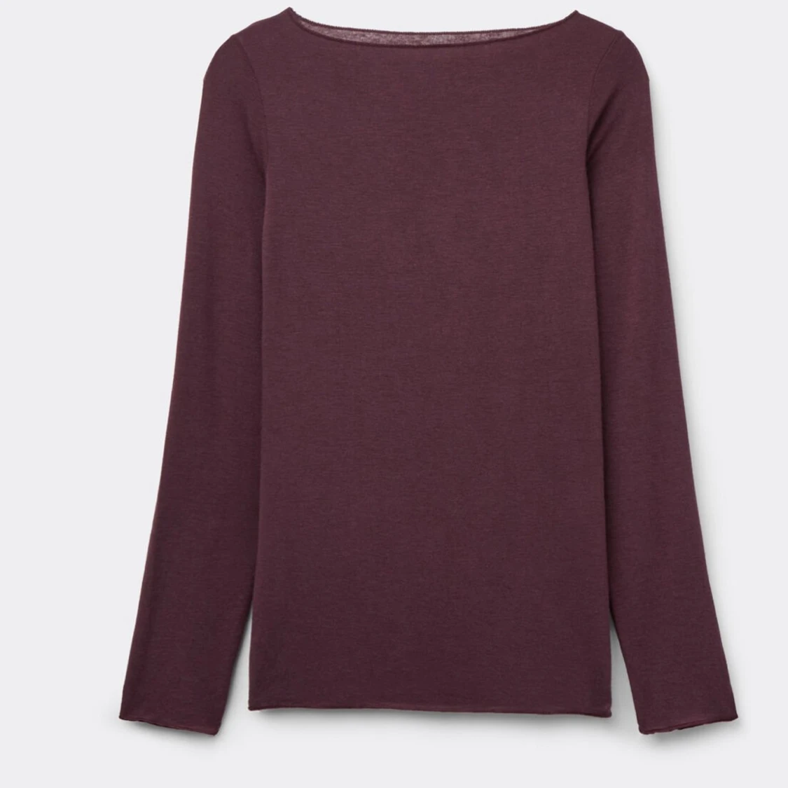 En stilren mörklila långärmad topp med rund halsringning. Toppen är figurnära och har en enkel, slät design utan synliga detaljer. Perfekt att matcha med jeans eller kjol för en clean look.