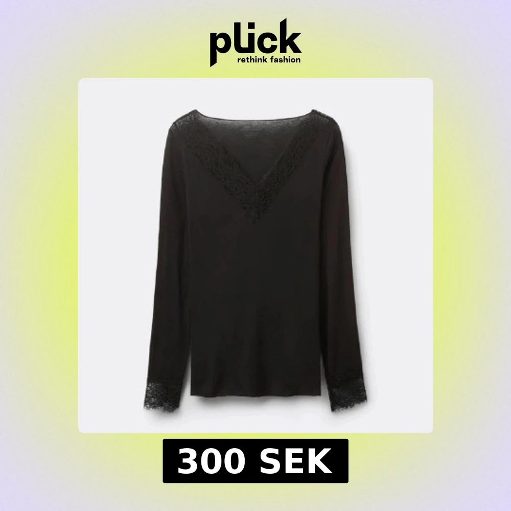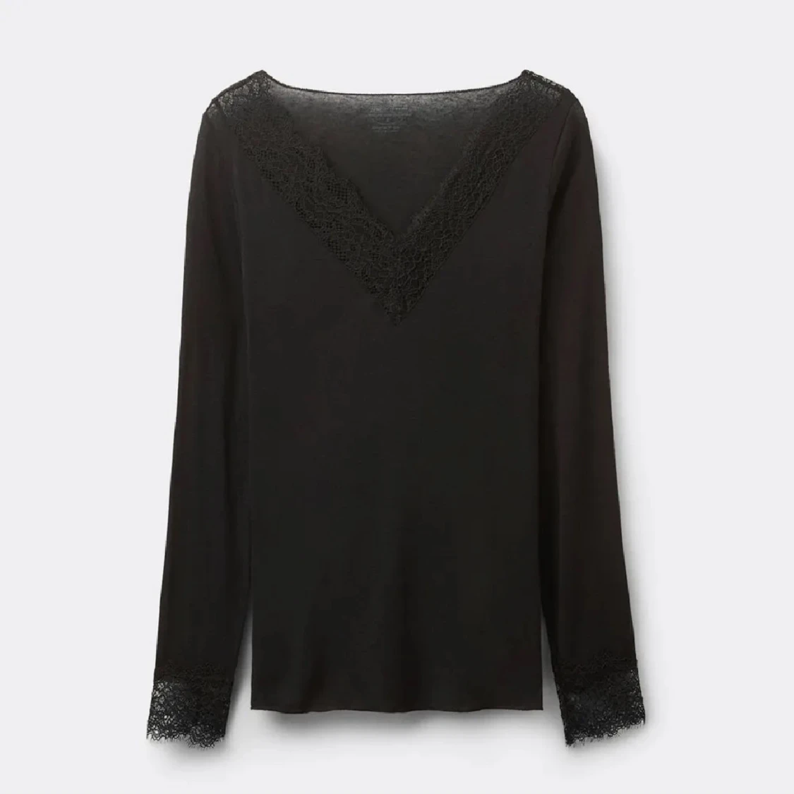 Stilren svart långärmad blus med v-ringning och fina spetsdetaljer både vid halsringningen och ärmsluten. Perfekt för dig som gillar en enkel men ändå elegant look.