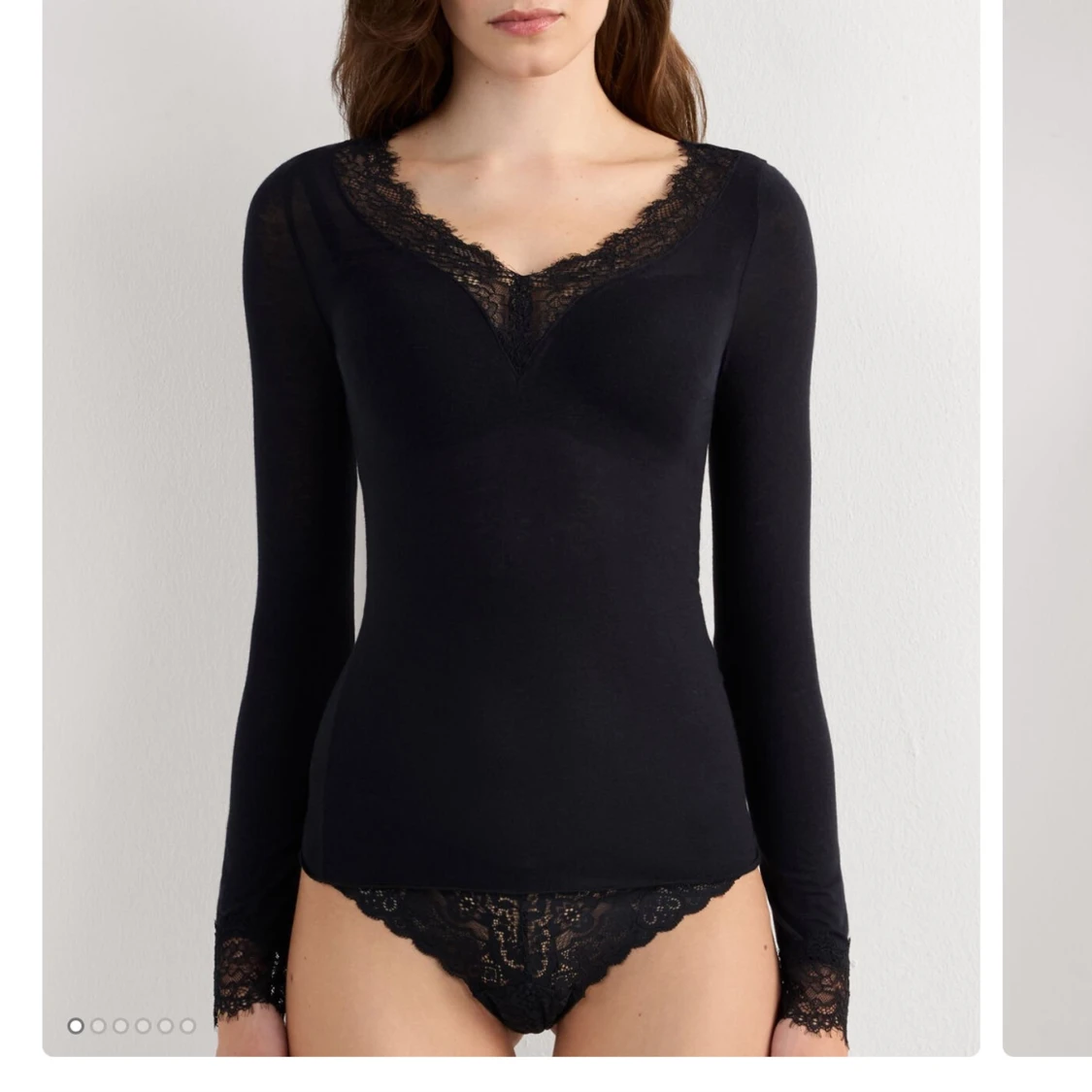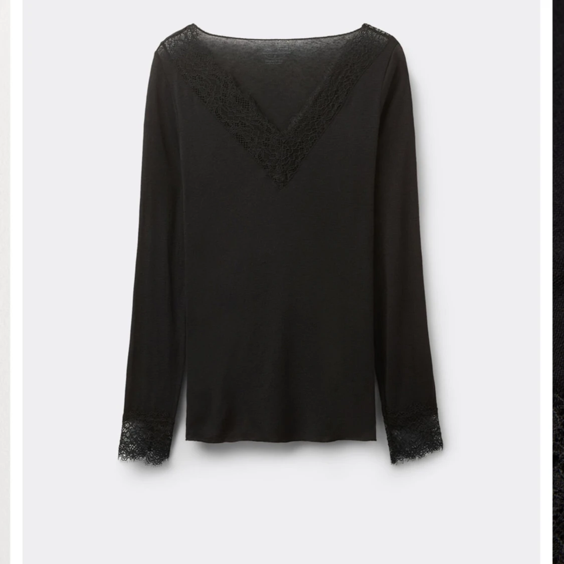 Använd fåtal gånger👌🏻Supersnygg svart långärmad blus med v-ringning och spetsdetaljer vid halsringning och ärmslut. Toppens smala passform och tunna material gör den perfekt att styla med jeans eller kjol. Spetsen ger en extra touch av elegans och trend.