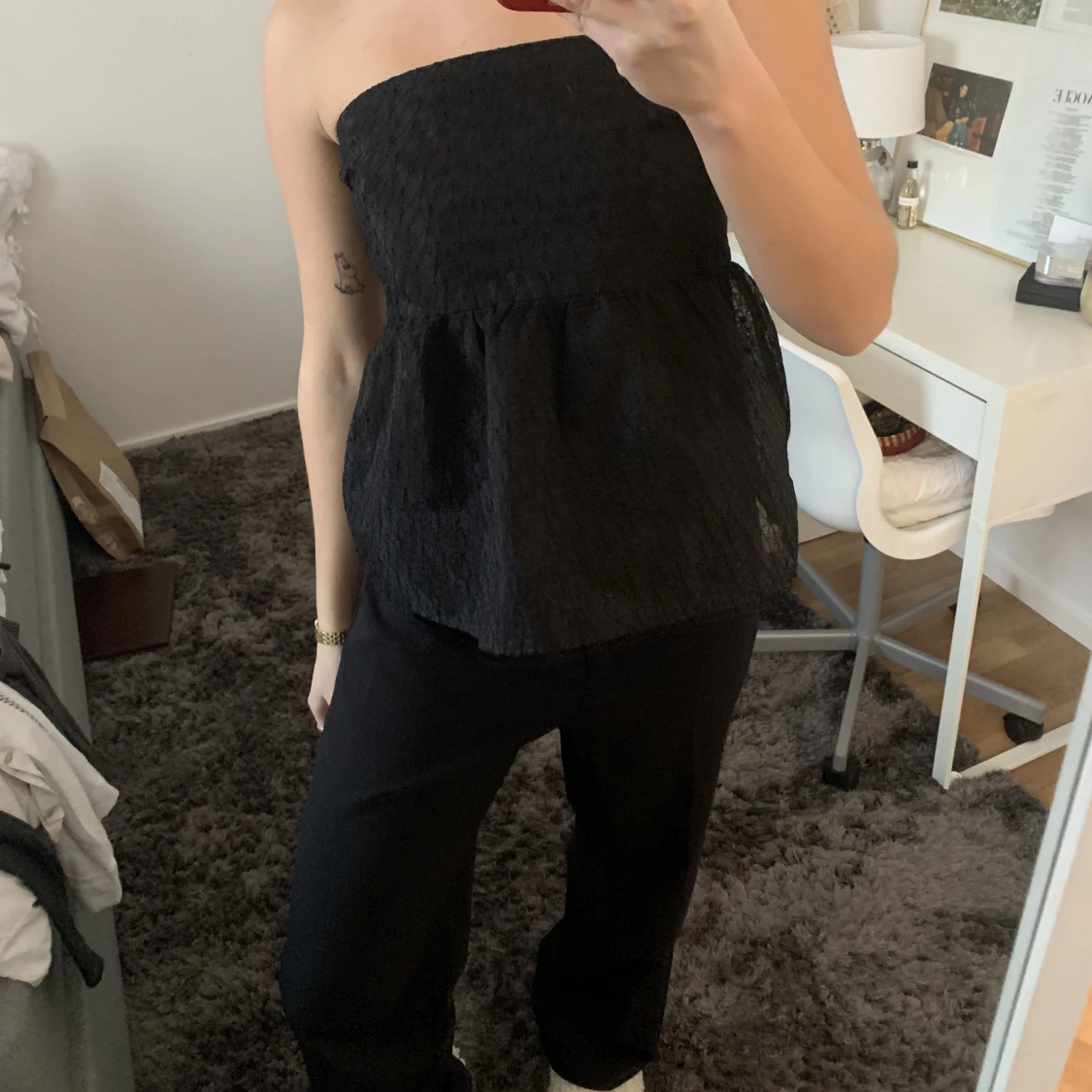 Bandeau topp från hm! Stor ”volang” nedtill, den har också tunna axelband som sitter fast men brukar vika ner dom och ha axelbandslöst. Jättefint mönster i typ jaquard. Använd fåtal gånger 💞